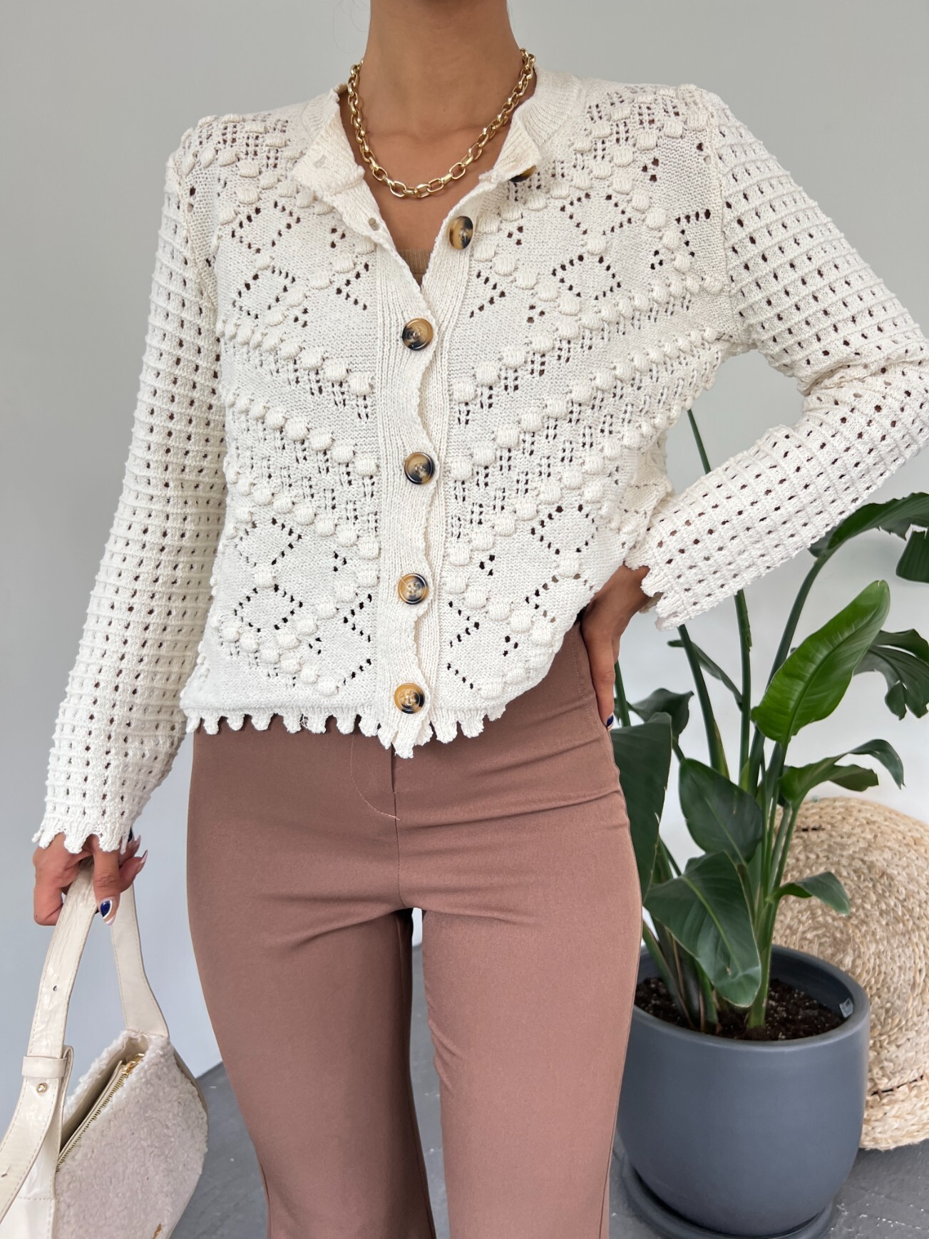 Ponponlu Ajurlu Düğmeli Hırka -Ekru-Ekru