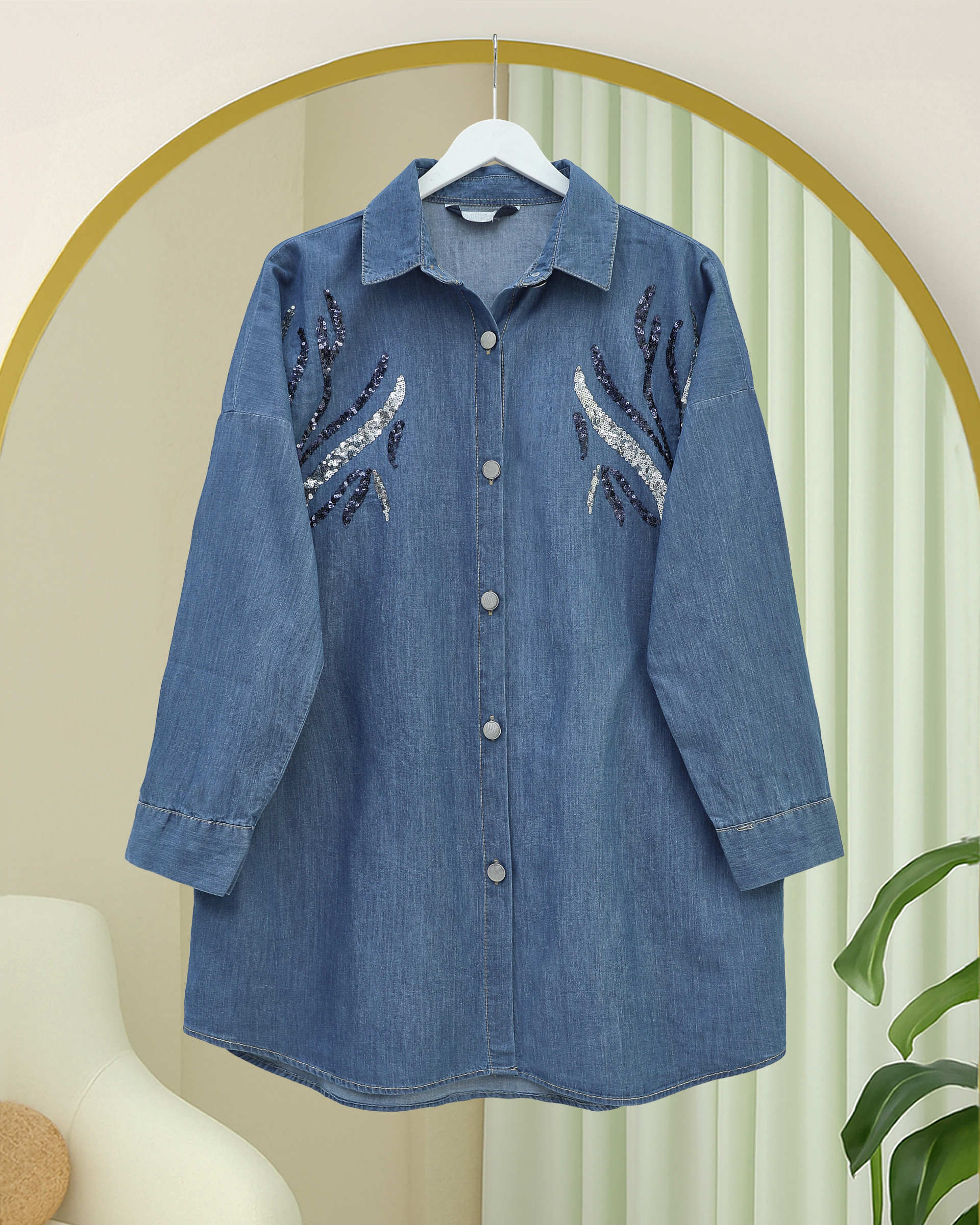 Pul Payetli Metal Düğmeli Salaş Kot Gömlek -İndigo-İndigo