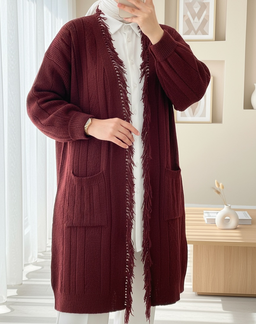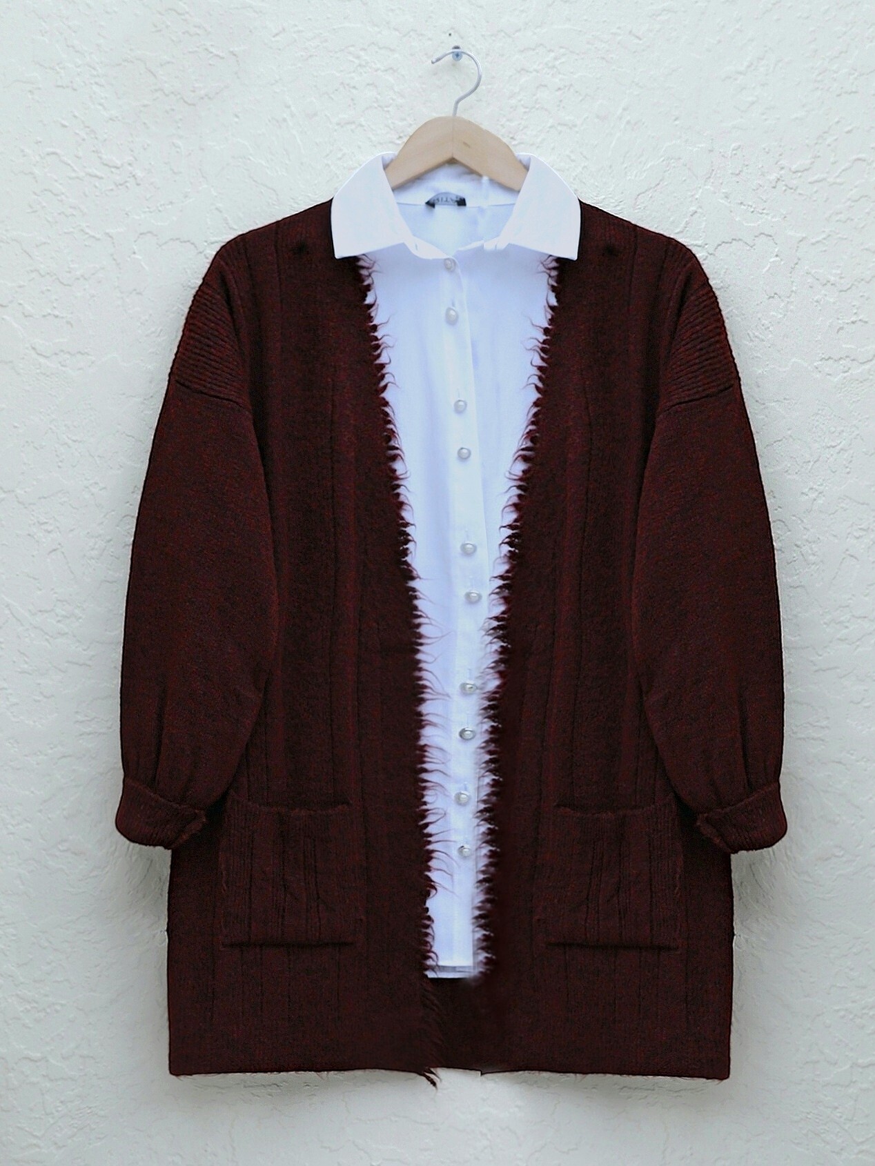 Püskül Detaylı Cepli Triko Hırka -Bordo-Bordo