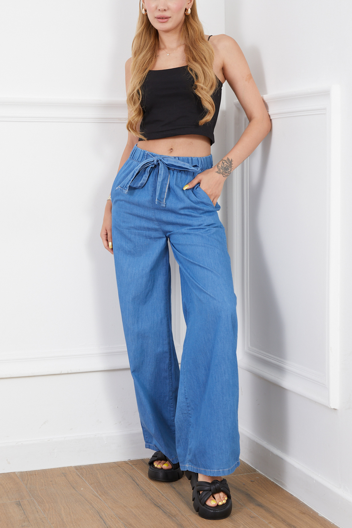 Rahat Kesim Beli Lastikli İnce Kot Pantolon-Mavi