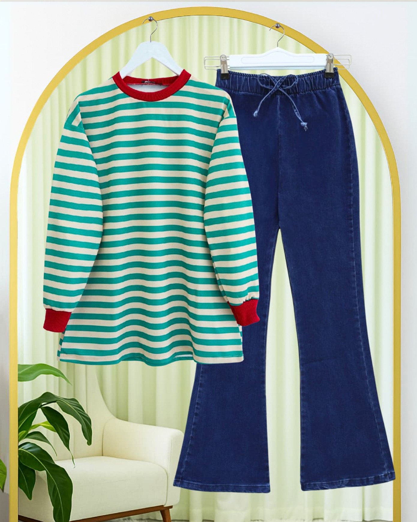 Renkli Çizgili Yuvarlak Yaka Sweat -Zümrüt-Zümrüt