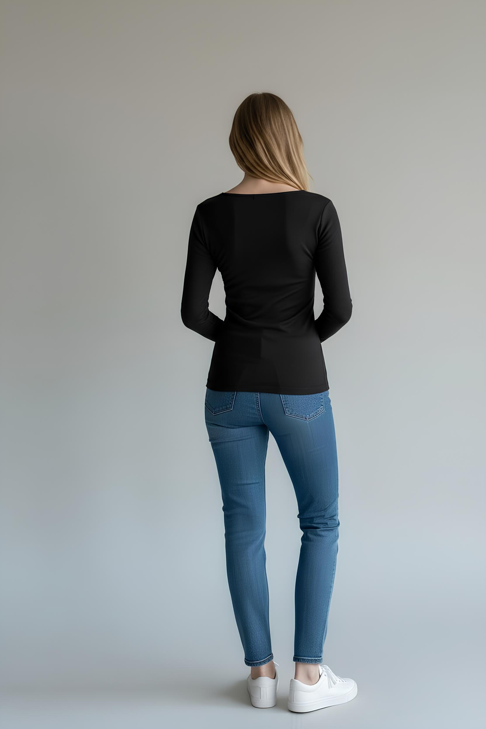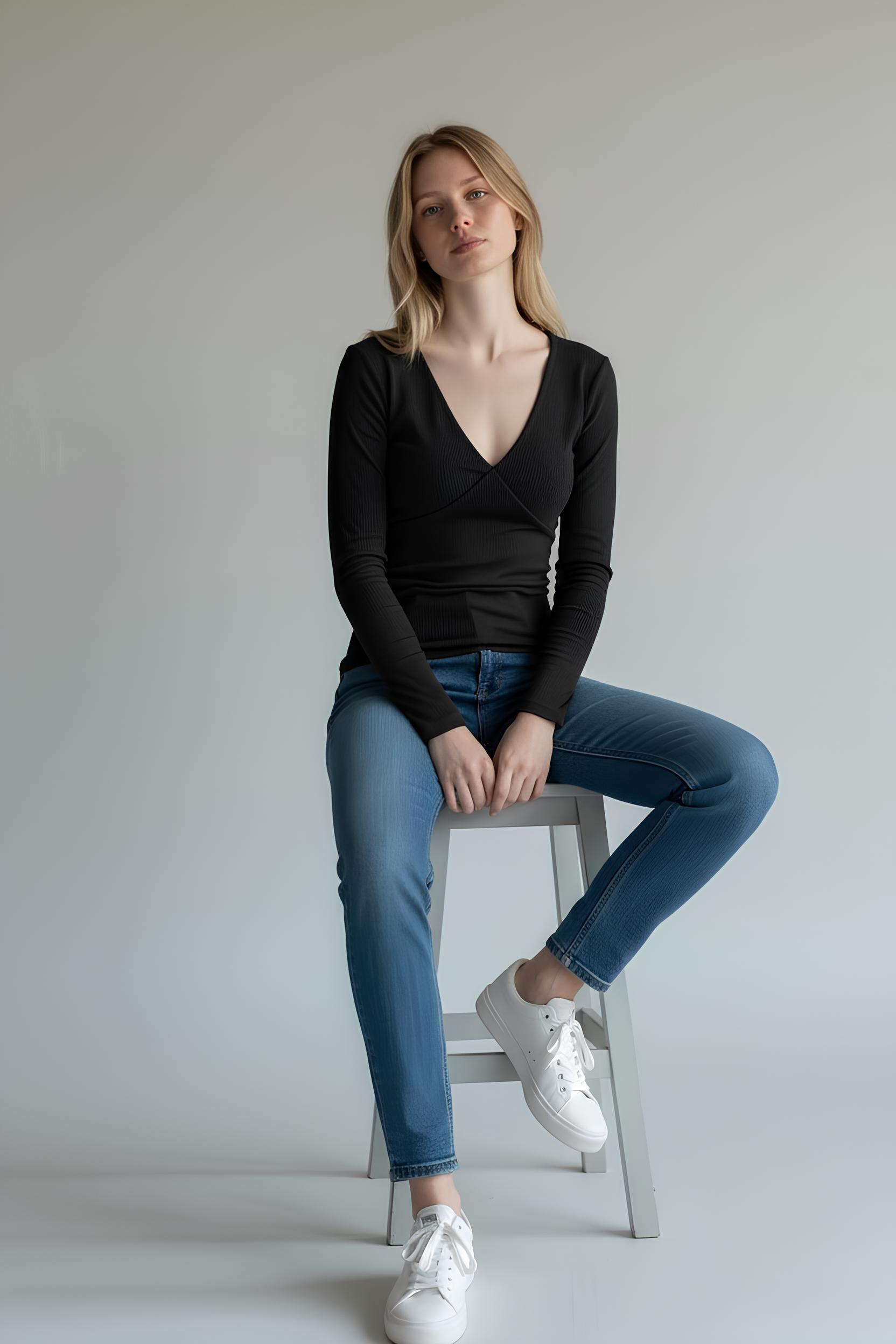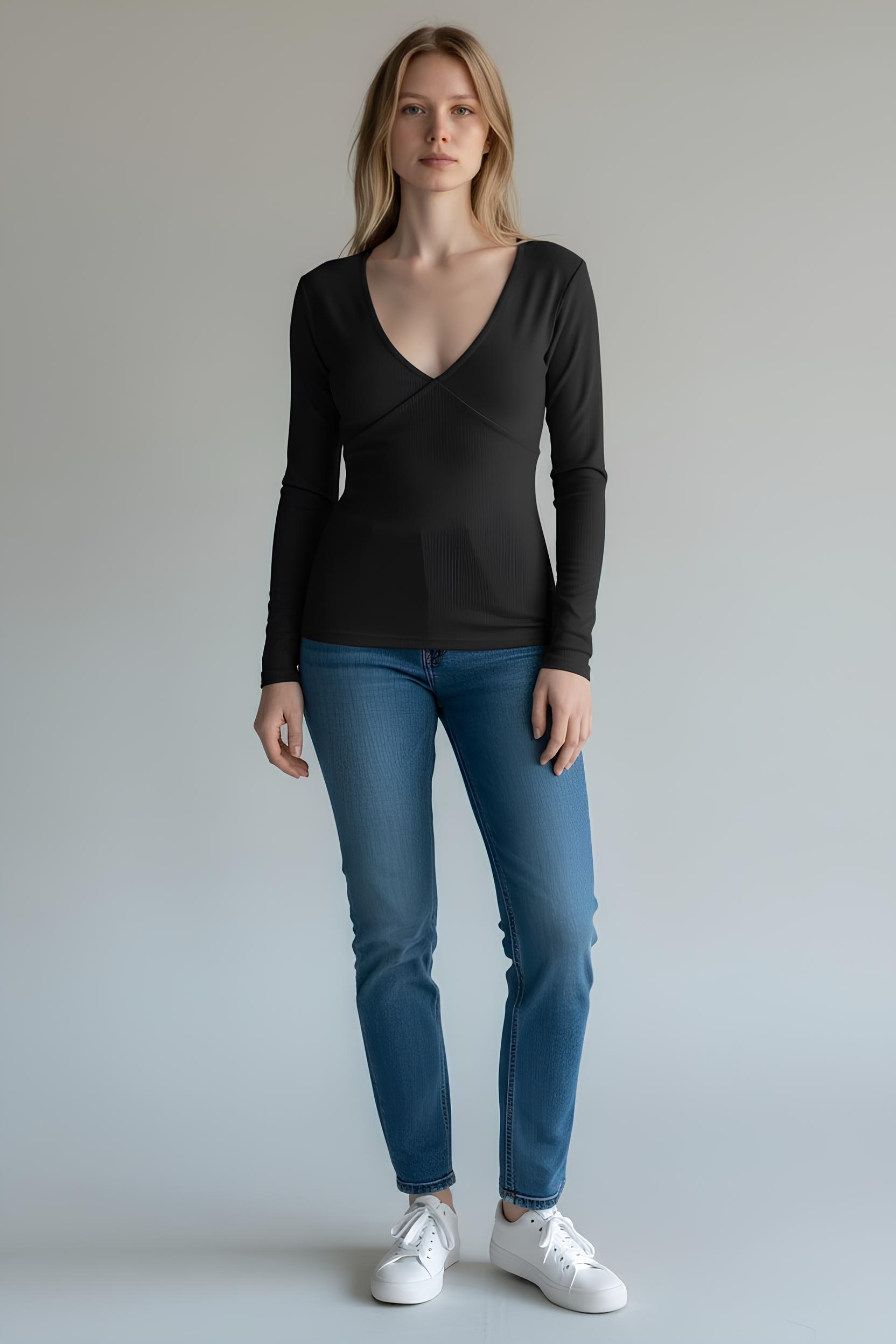 Ribanalı V Yaka Robalı Bluz Siyah- 5157-Siyah