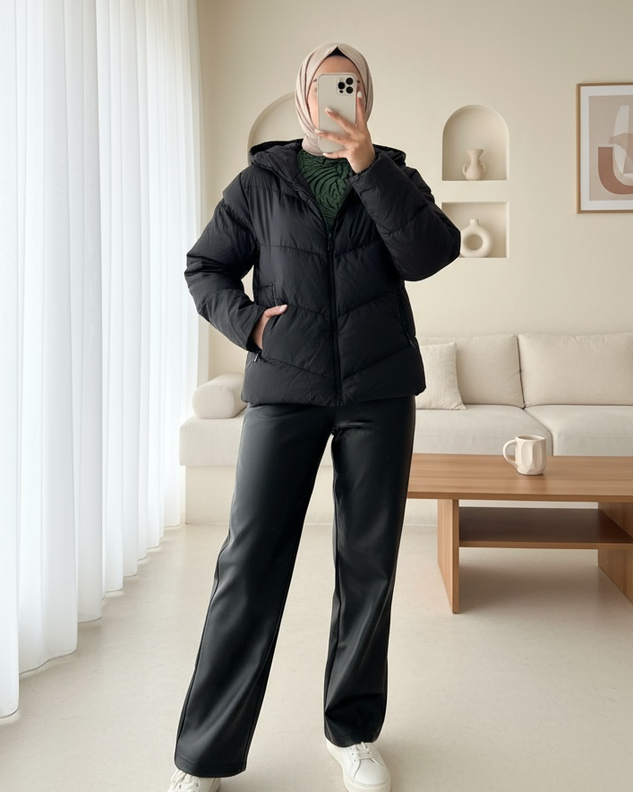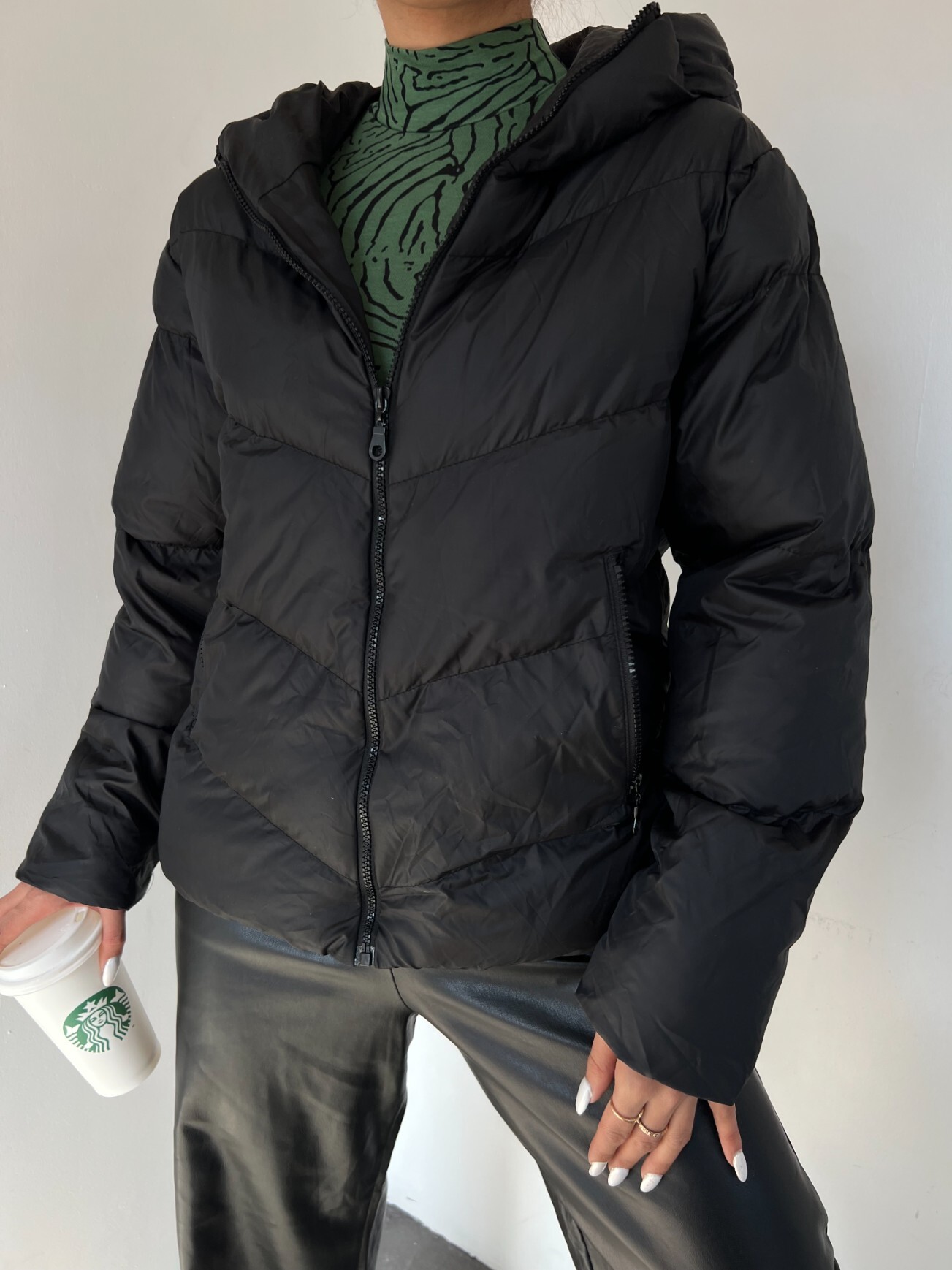 Sabit Kapşonlu Fermuarlı Kışlık Mont -Siyah-Siyah