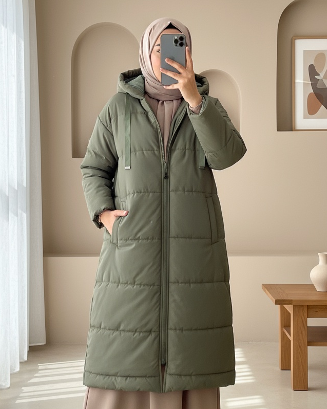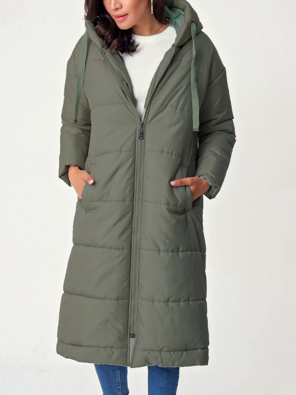 Sabit Kapşonlu Kuş Gözü Detaylı Uzun Kaban -Haki-Haki