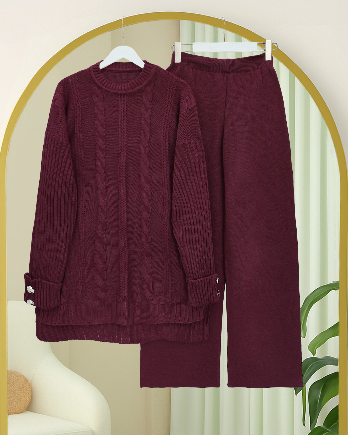 Saç Örgü Desen Kolu Düğme Detaylı Triko Takım -Bordo-Bordo
