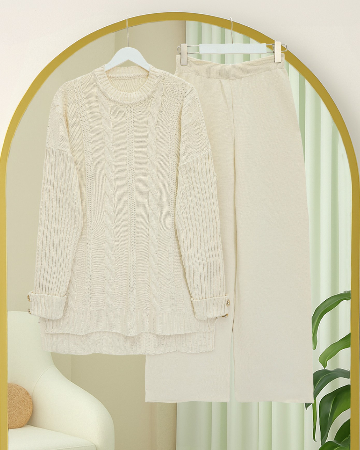 Saç Örgü Desen Kolu Düğme Detaylı Triko Takım -Ekru-Ekru