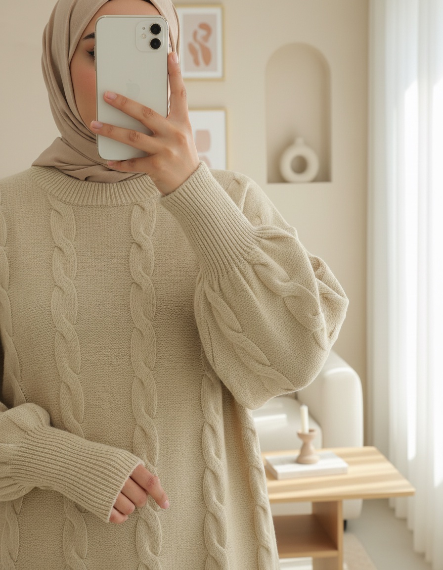 Saç Örgü Desen Yumoş Triko Kazak -Açık Vizon-Açık Vizon