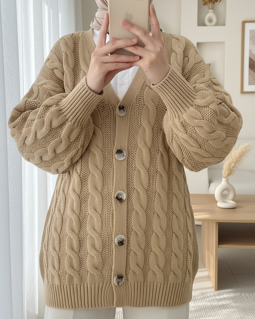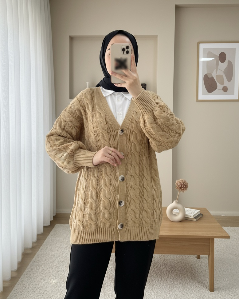 Saç Örgülü Düğmeli Triko Hırka -Vizon-Vizon