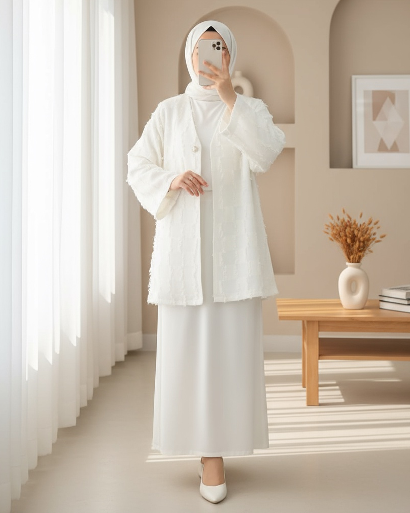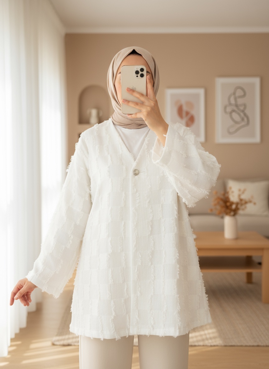 Saçaklı Tek Düğmeli Kare Desenli Kimona -Beyaz-Beyaz