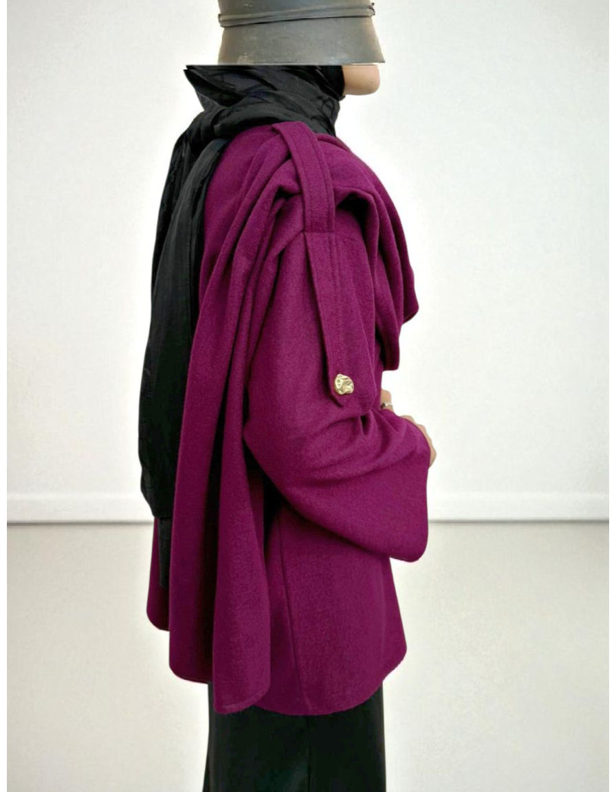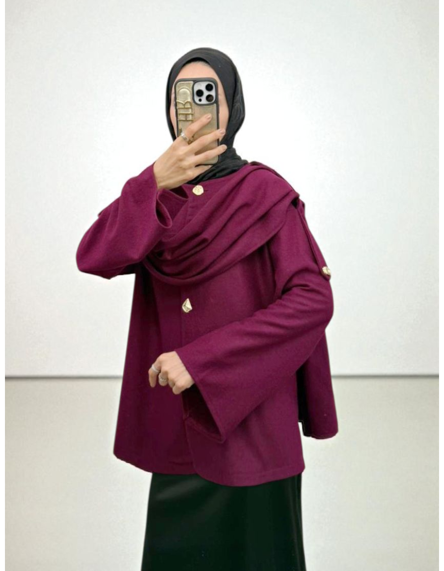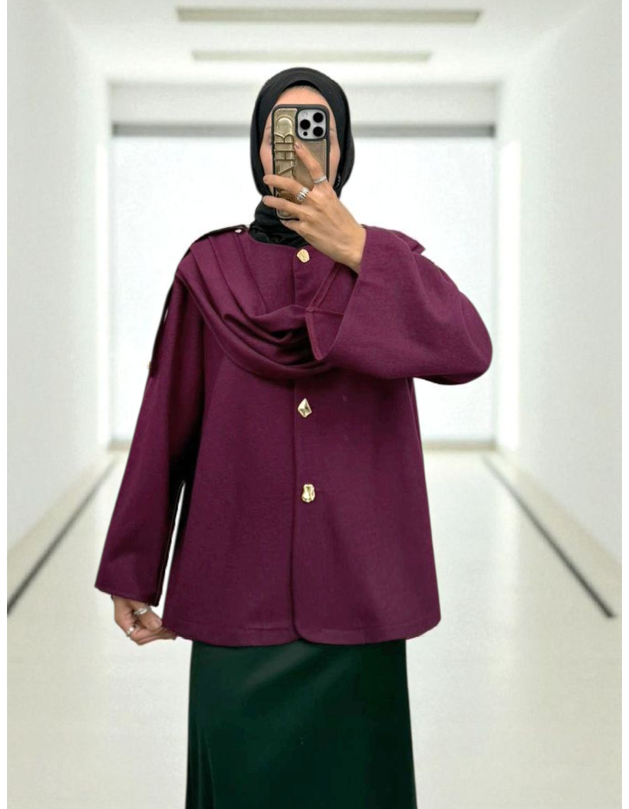Şal Detaylı Kışlık Keçe Ceket -Mürdüm-Mürdüm