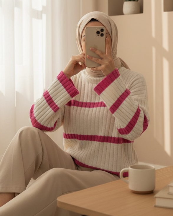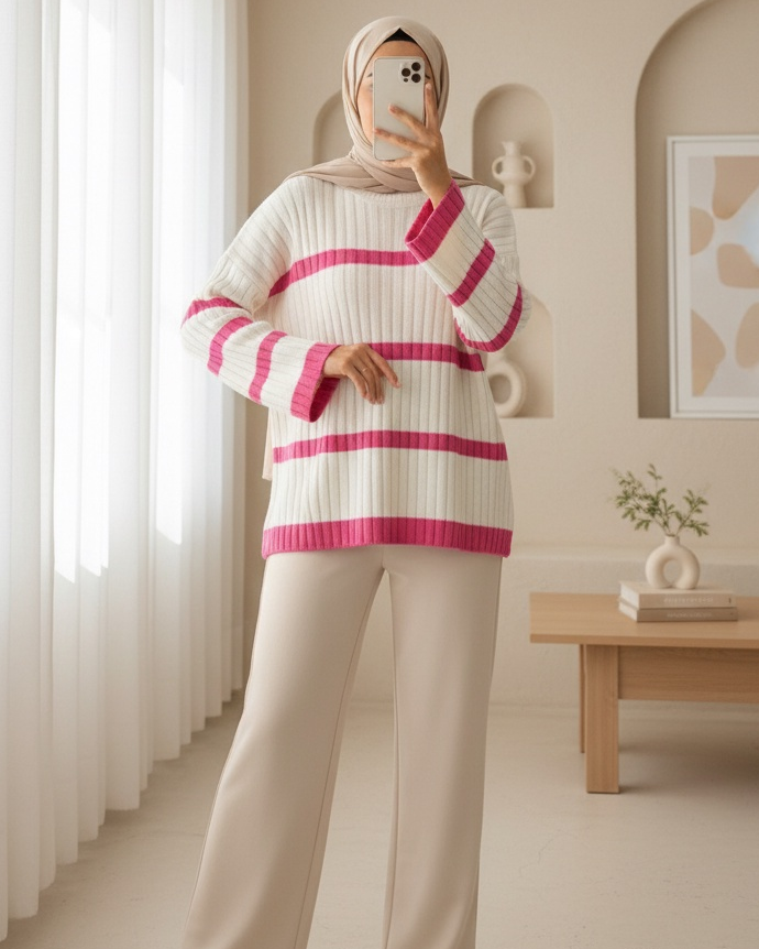 Salaş Kollu Çizgili Triko Kazak -Ekru-Ekru