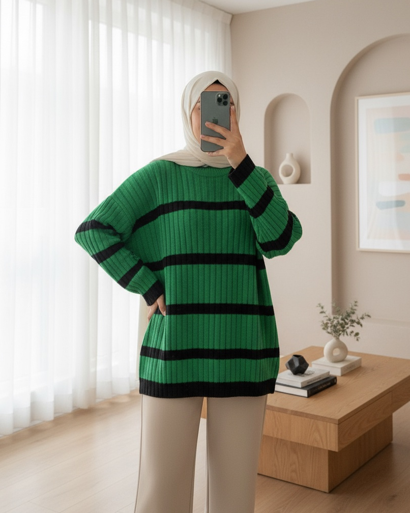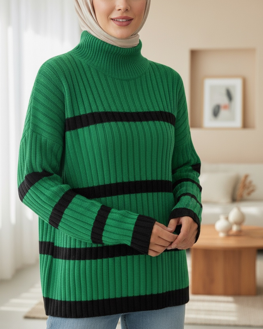 Salaş Kollu Çizgili Triko Kazak -Orman Yş.-Orman Yş.