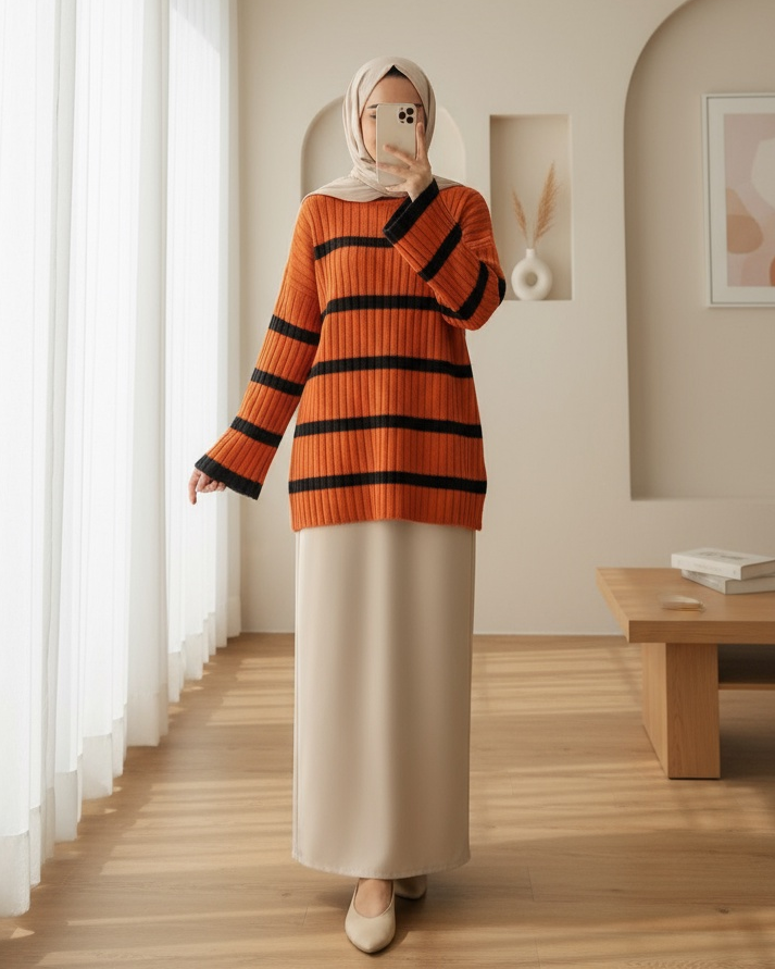 Salaş Kollu Çizgili Triko Kazak -Turuncu-Turuncu