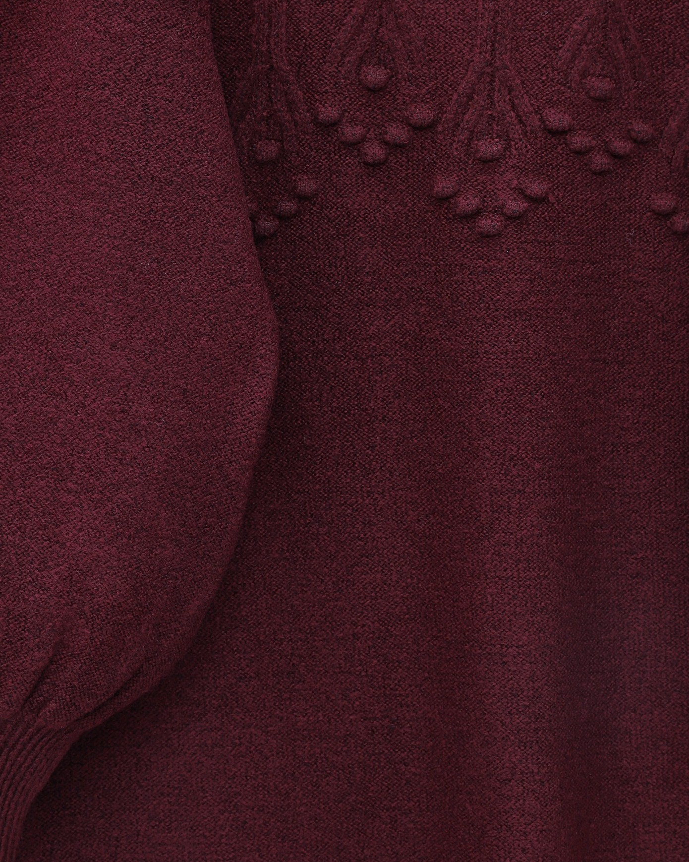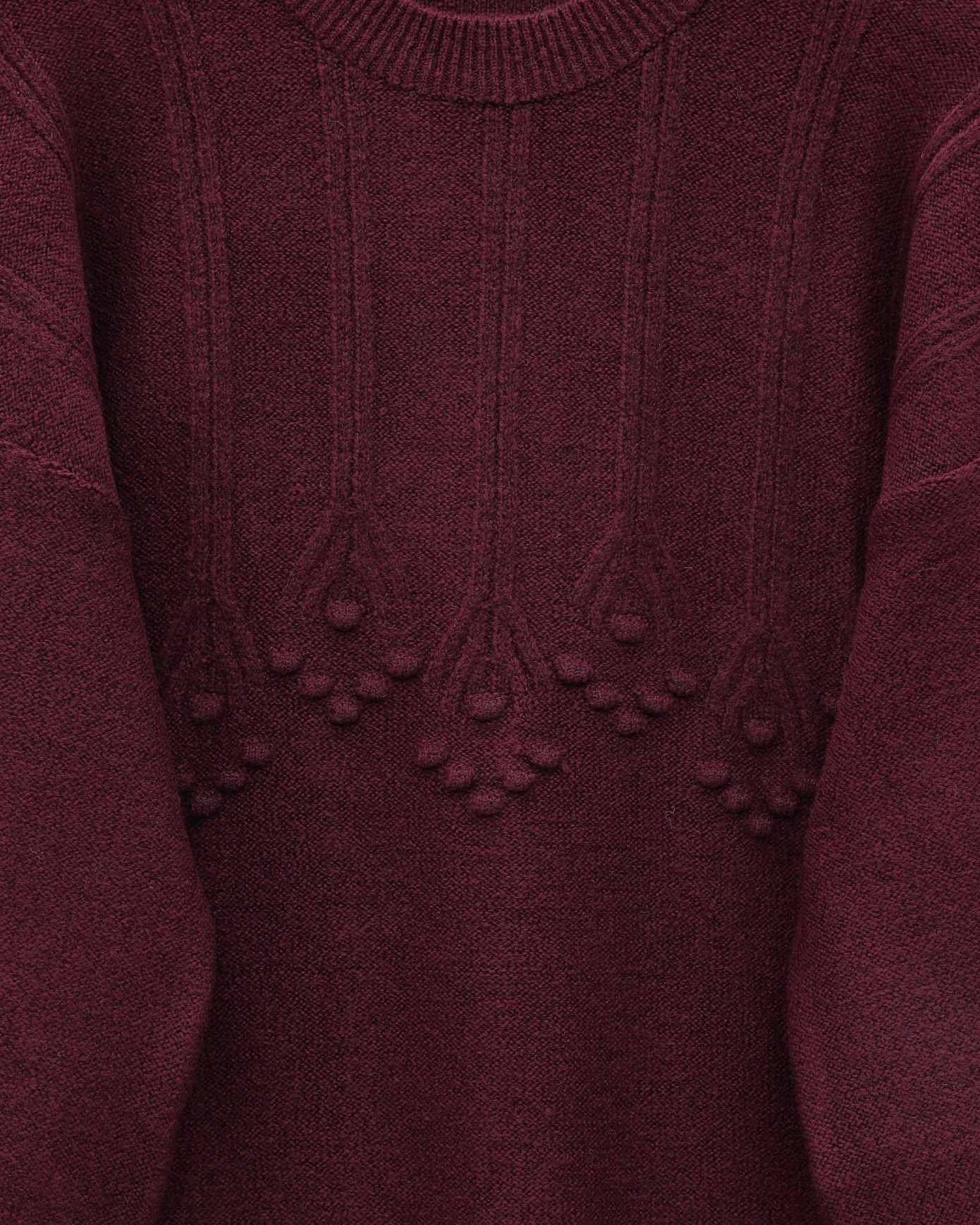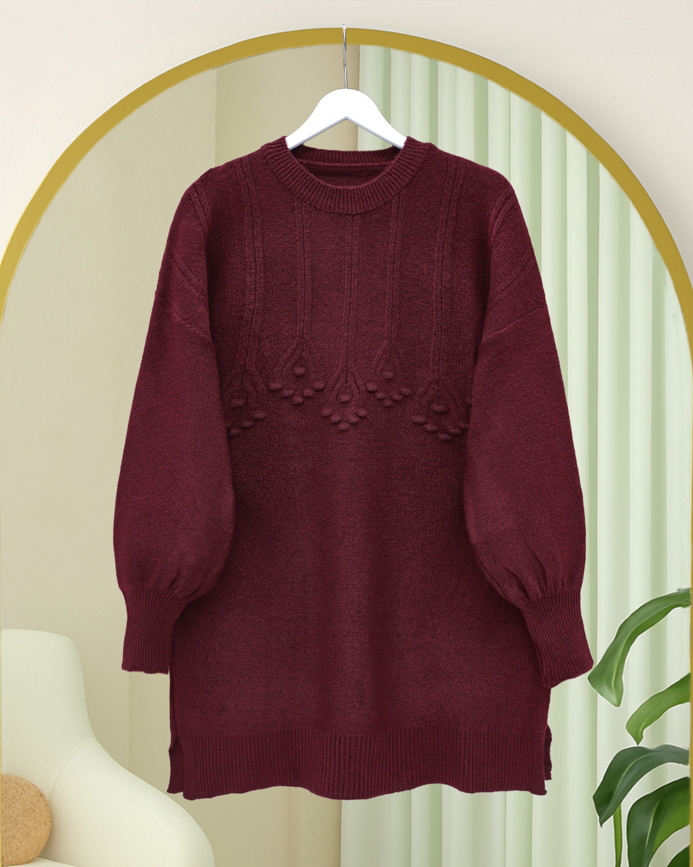 Şerit Ve Ponpon Detaylı Yuvarlak Yaka Yumoş Triko Tunik -Bordo-Bordo