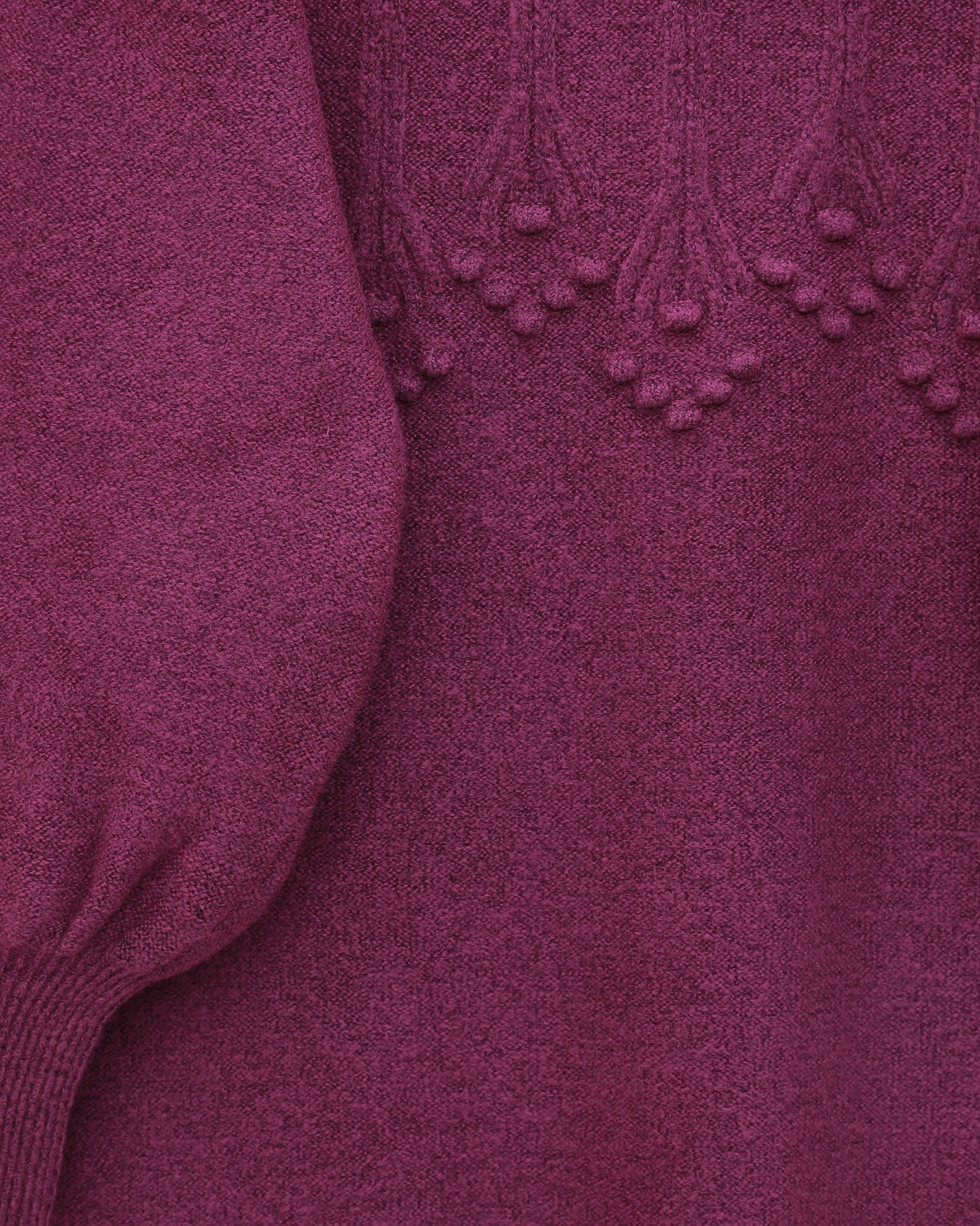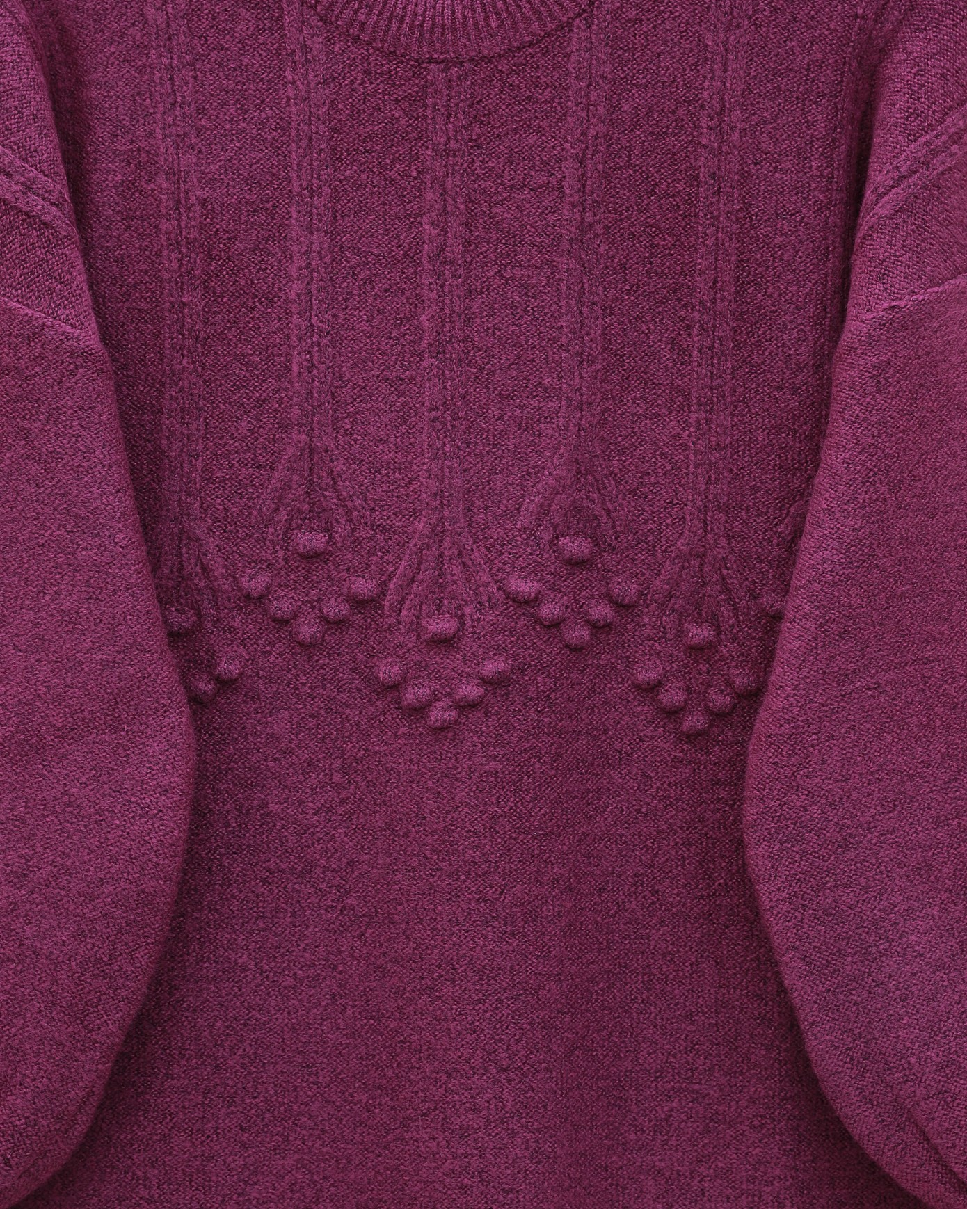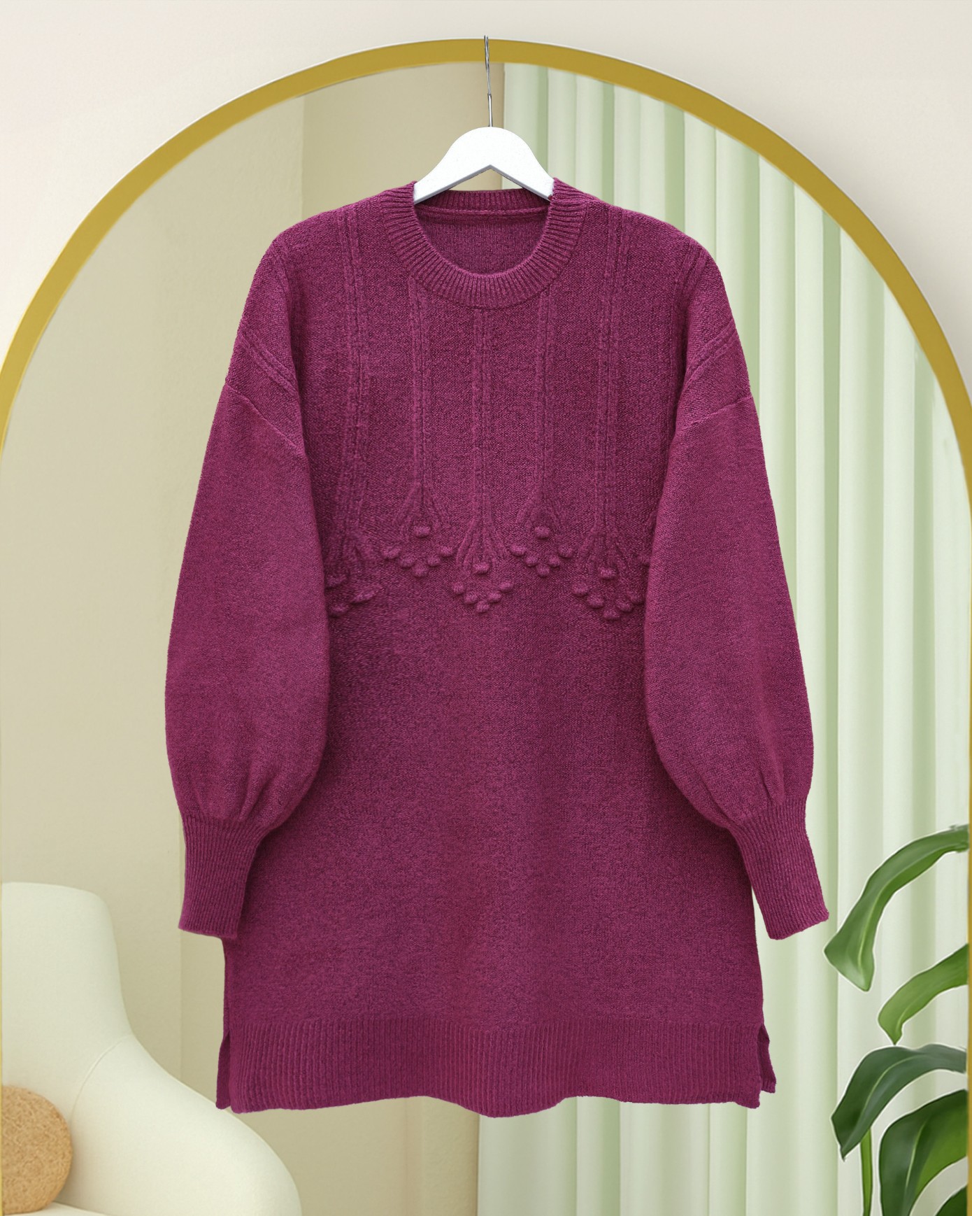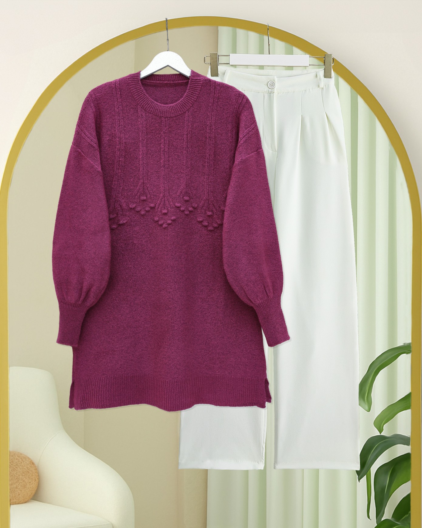 Şerit Ve Ponpon Detaylı Yuvarlak Yaka Yumoş Triko Tunik -Fuşya-Fuşya