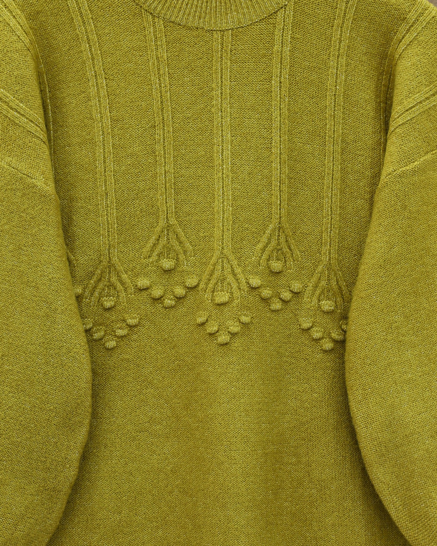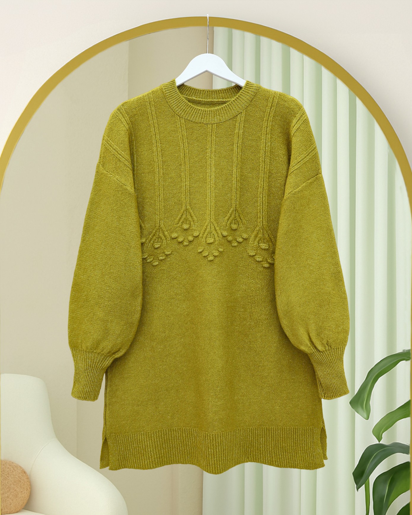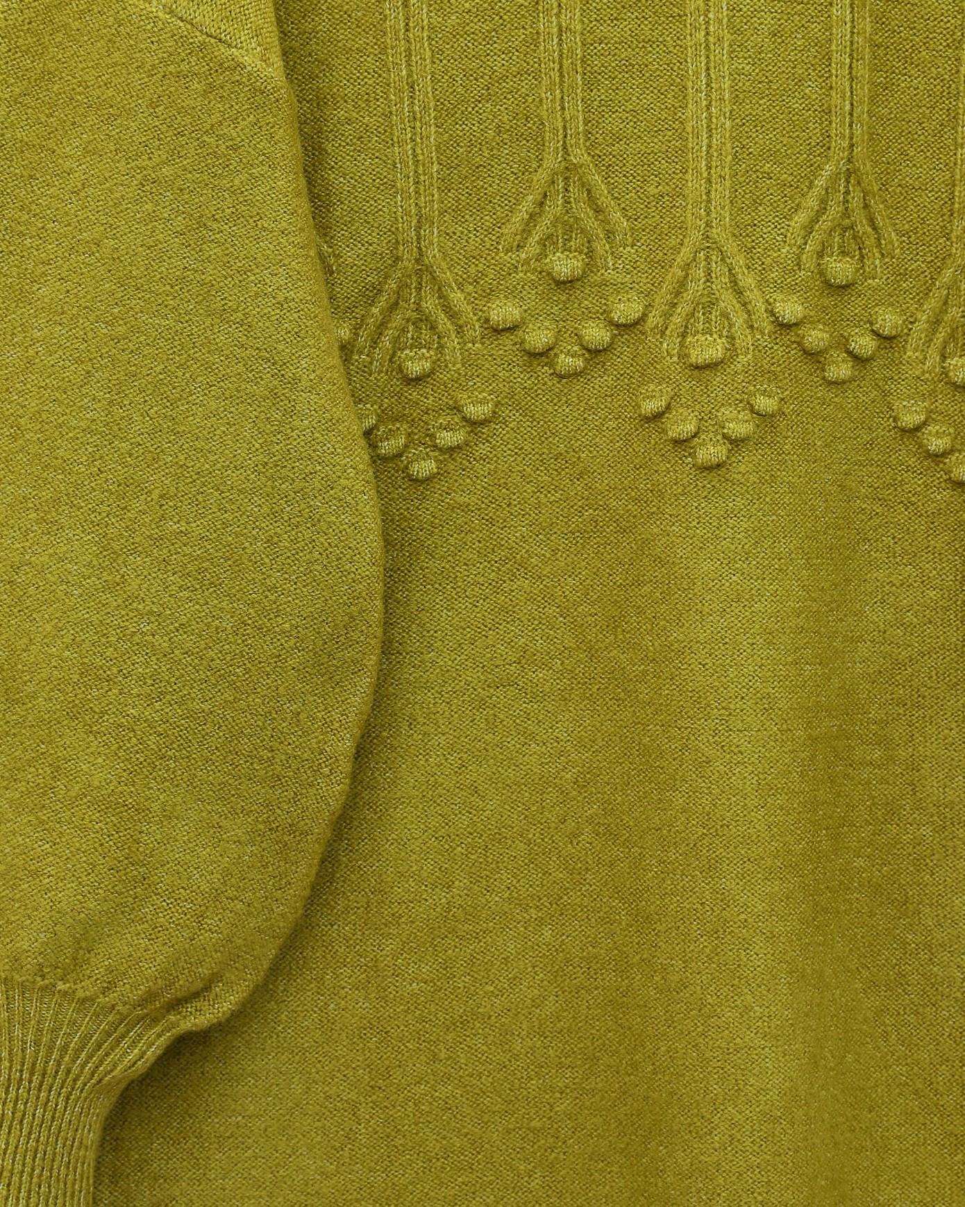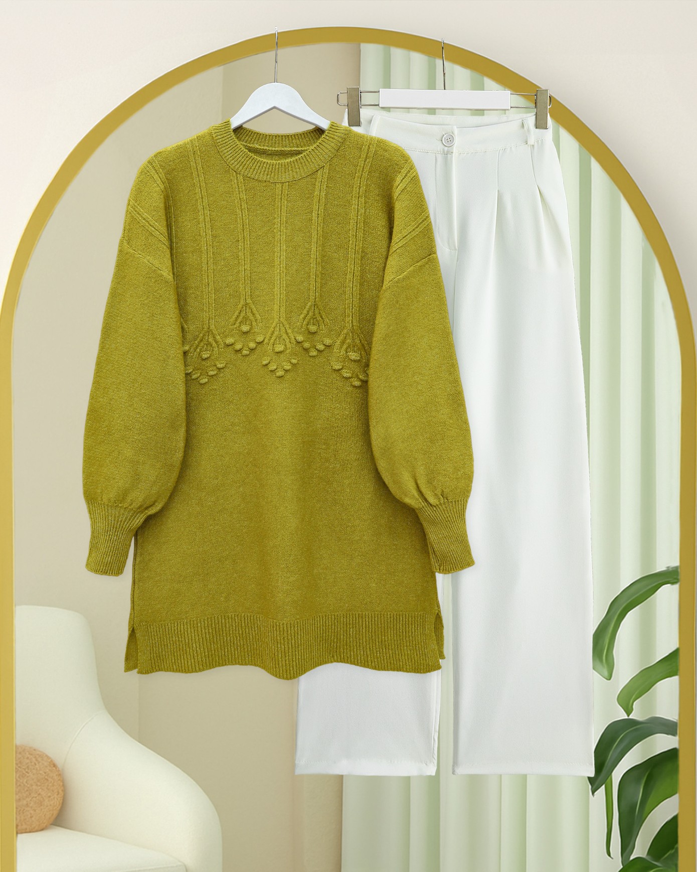 Şerit Ve Ponpon Detaylı Yuvarlak Yaka Yumoş Triko Tunik -Yağ Yeşili-Yağ Yeşili