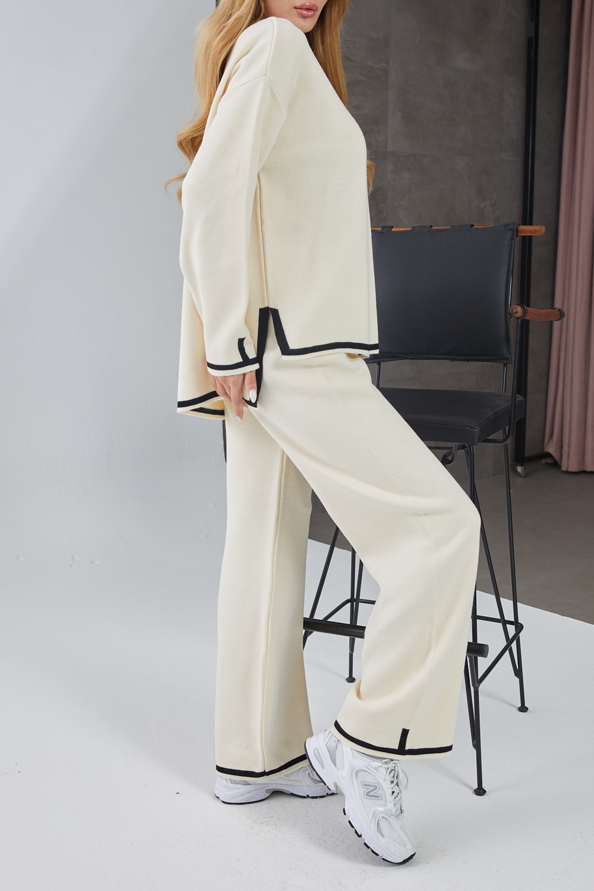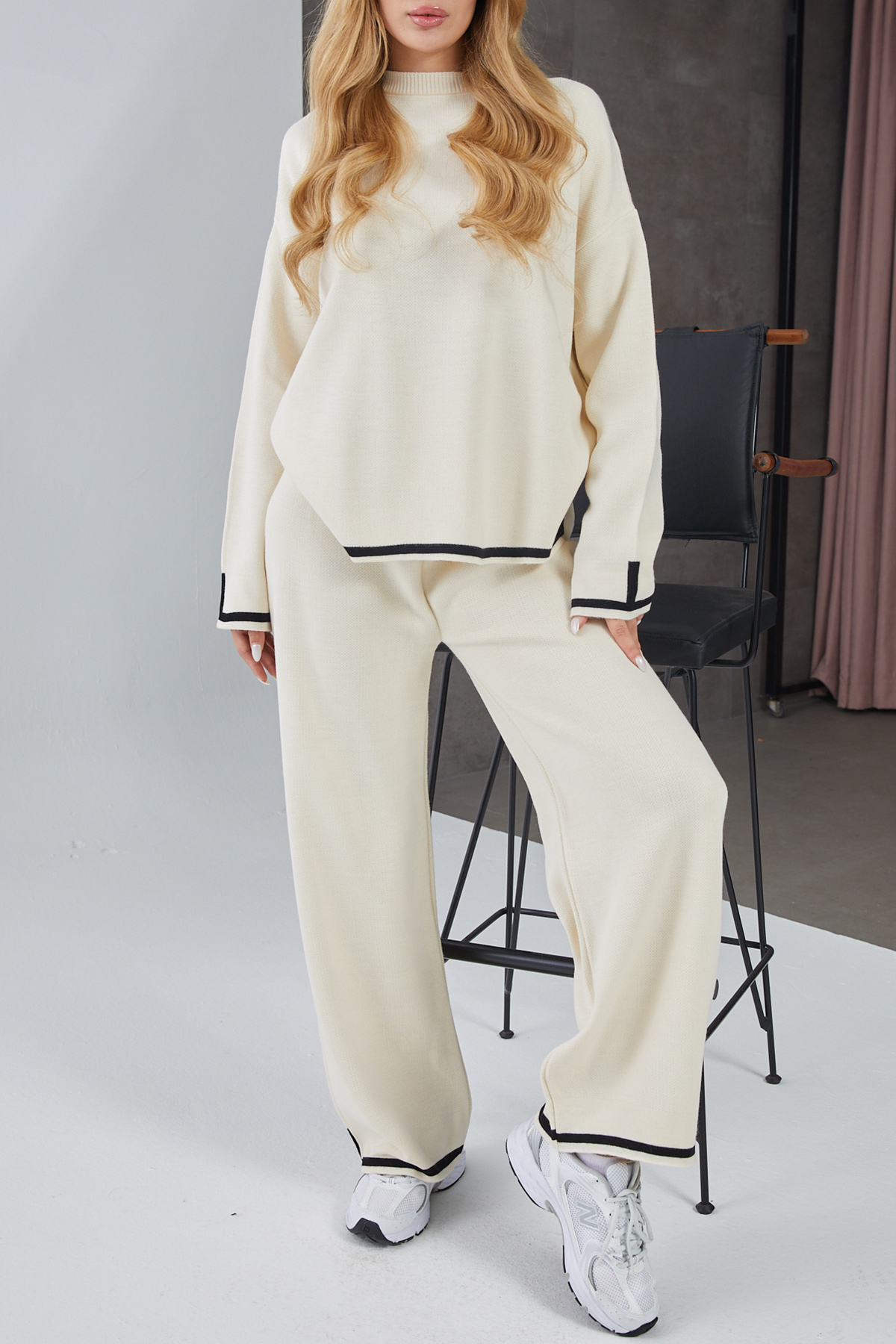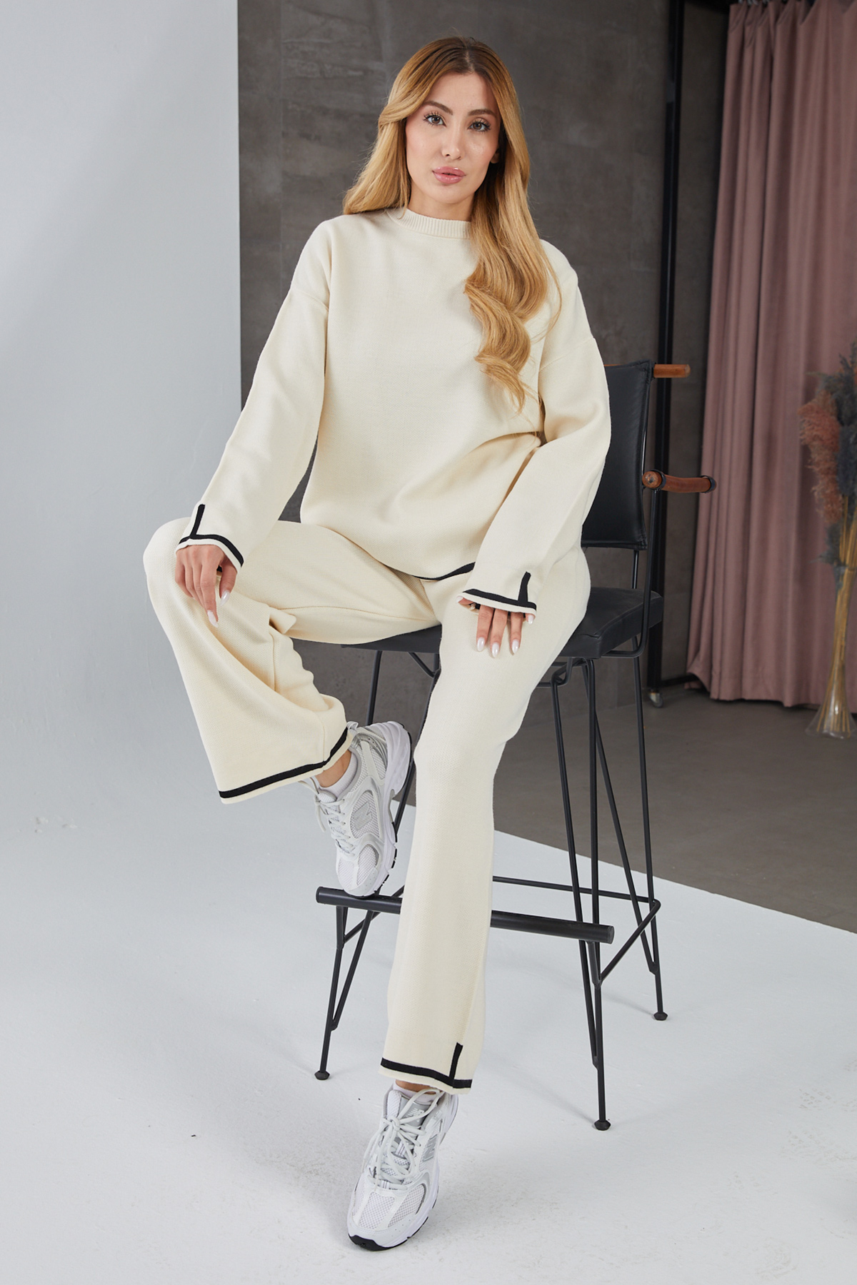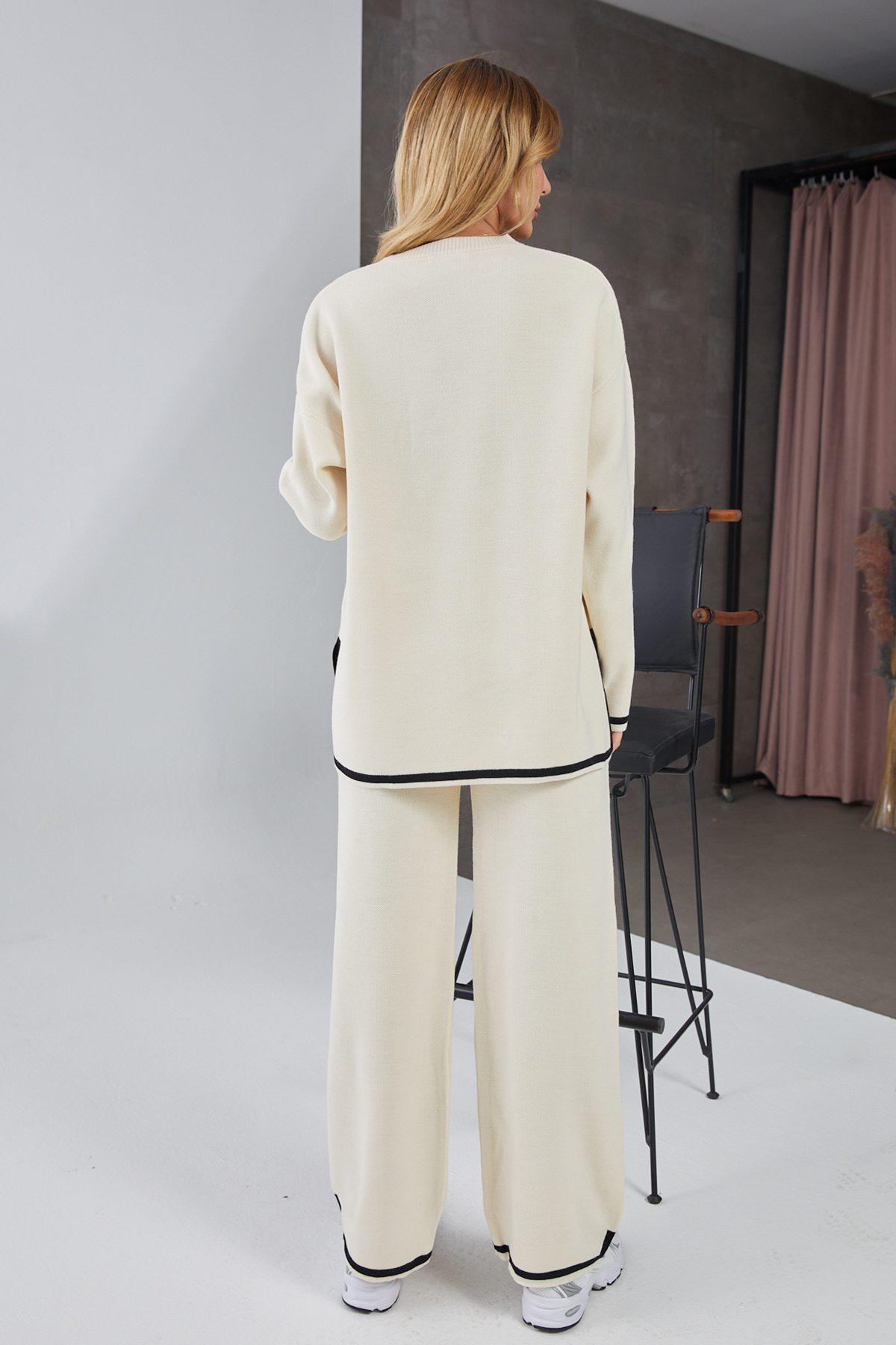 Şeritli Önü Kısa Arkası Uzun Kazak Pantolon Triko İkili Takım-Bej