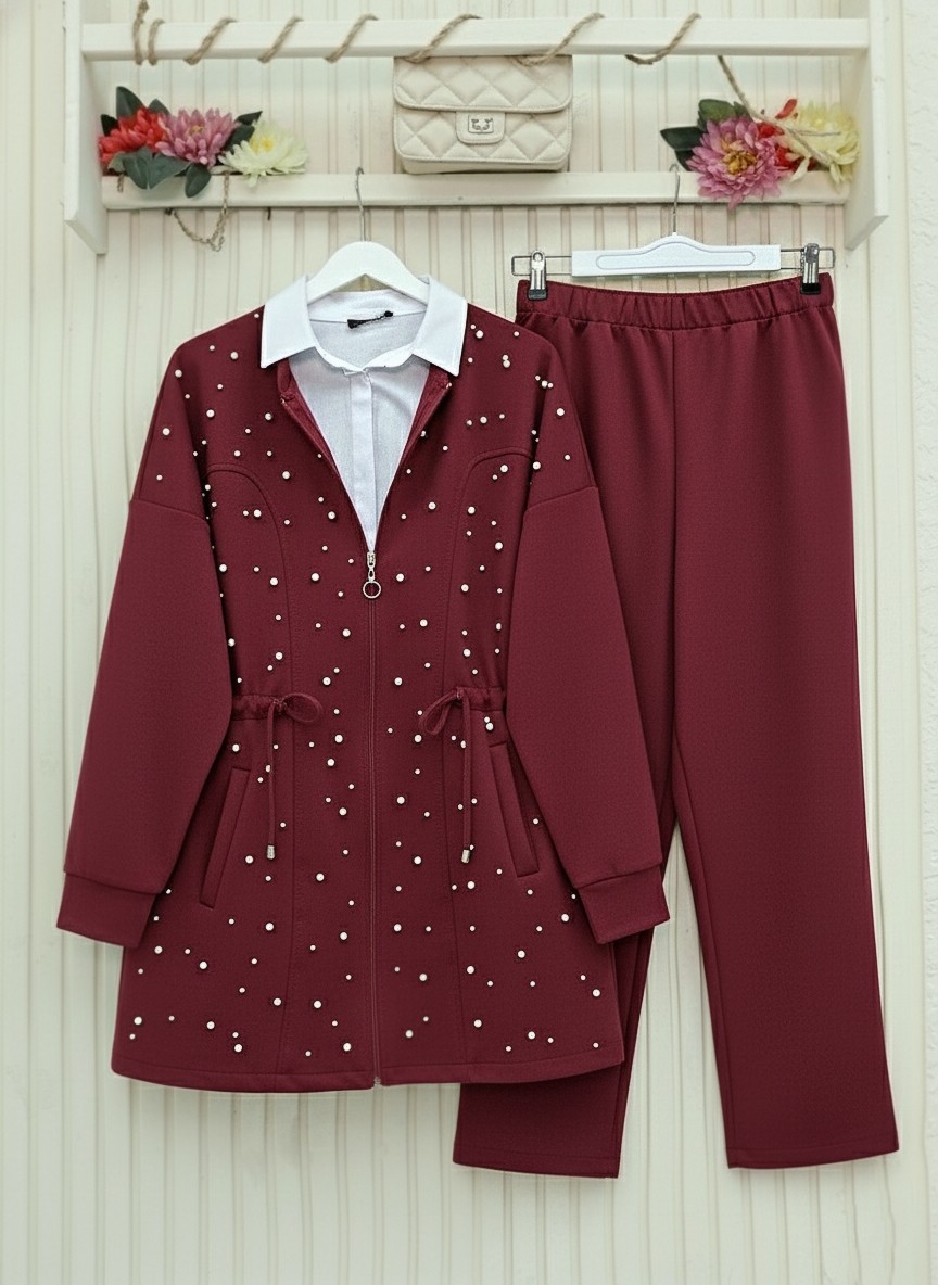 Serpme İncili Tünel Bağcıklı Scuba Takım -Bordo-Bordo