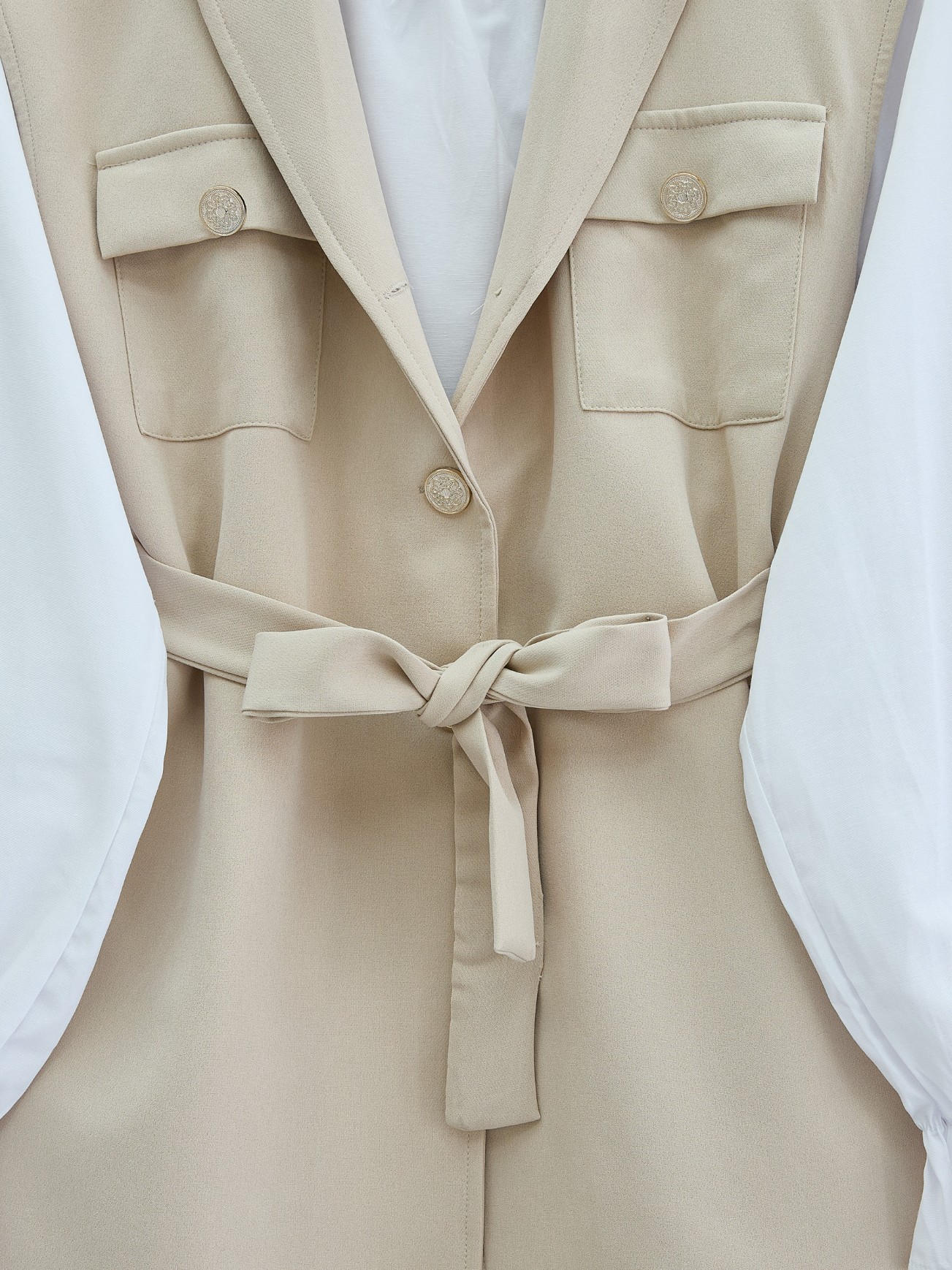 Sıfır Kol Önü Düğmeli Beli Kemerli Üçlü Takım -Bej-Bej