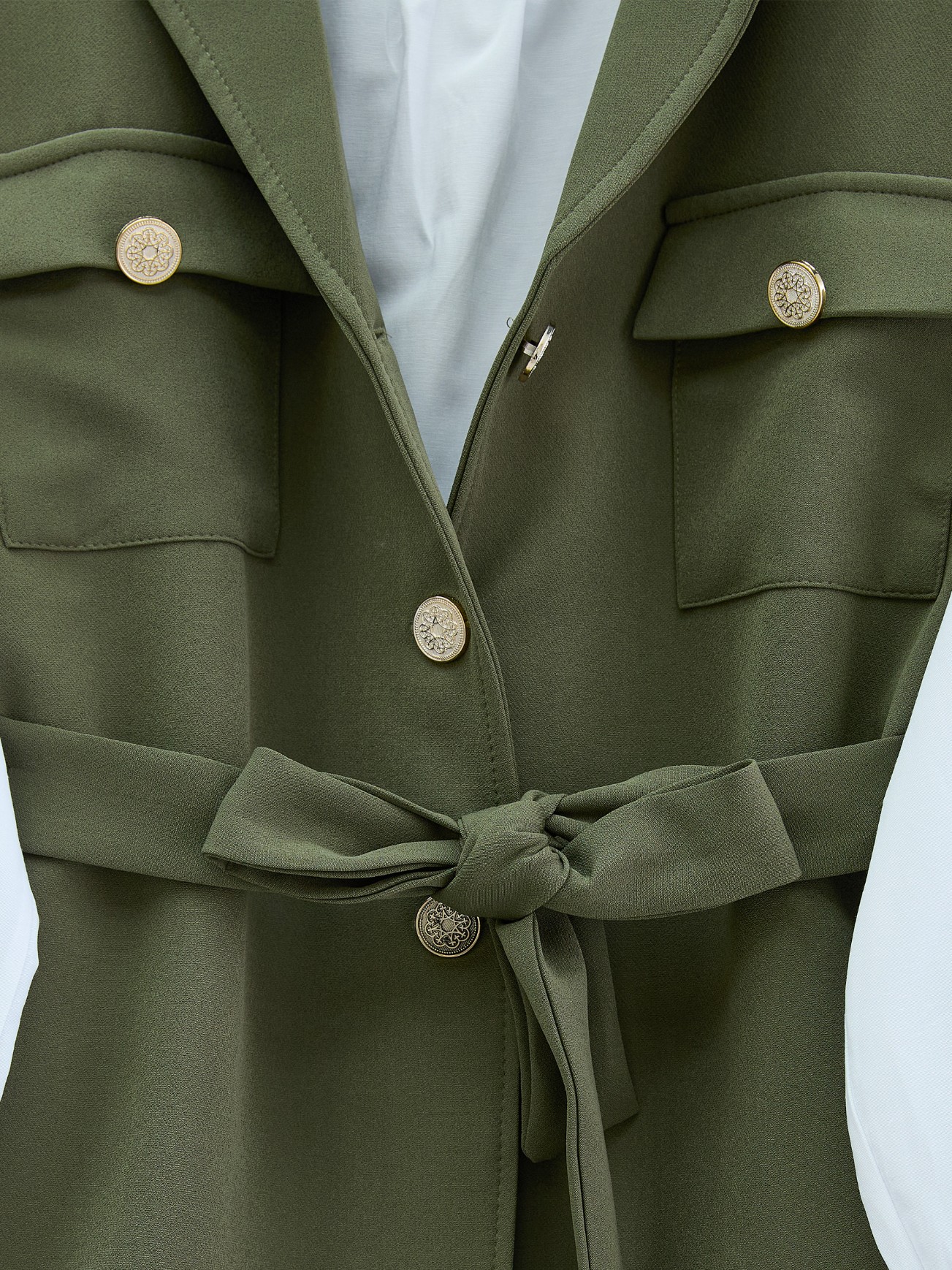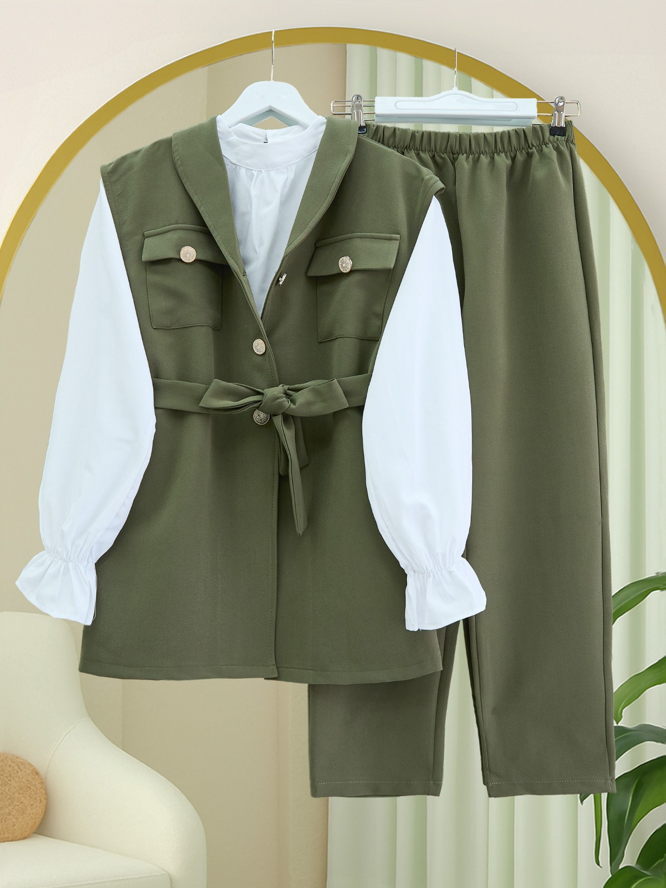 Sıfır Kol Önü Düğmeli Beli Kemerli Üçlü Takım -Haki-Haki