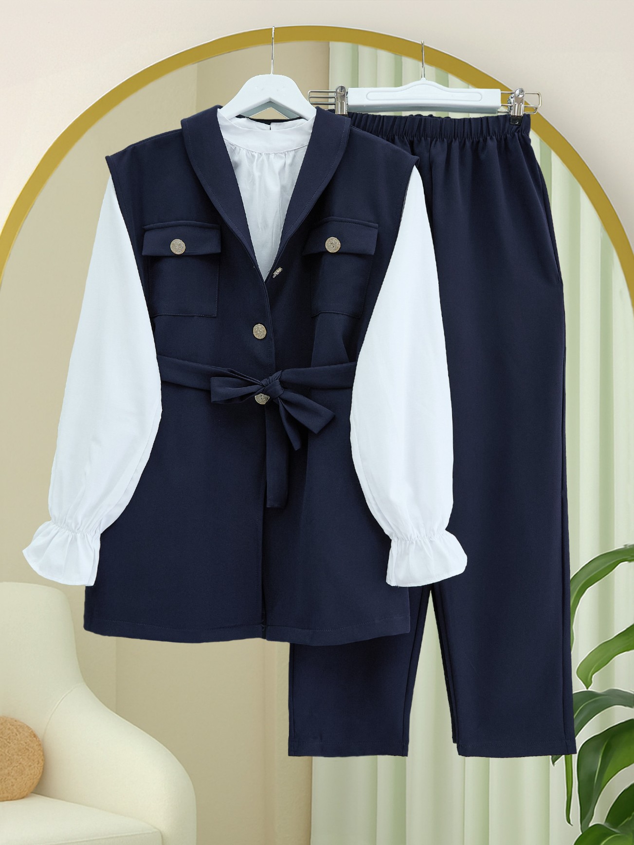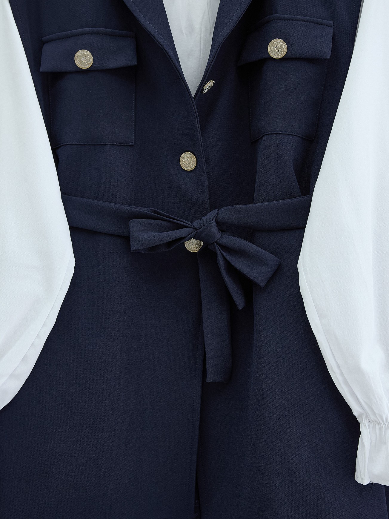 Sıfır Kol Önü Düğmeli Beli Kemerli Üçlü Takım -Laci-Lacivert