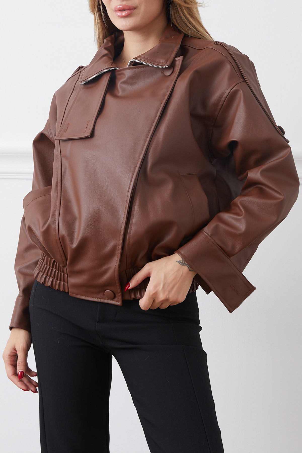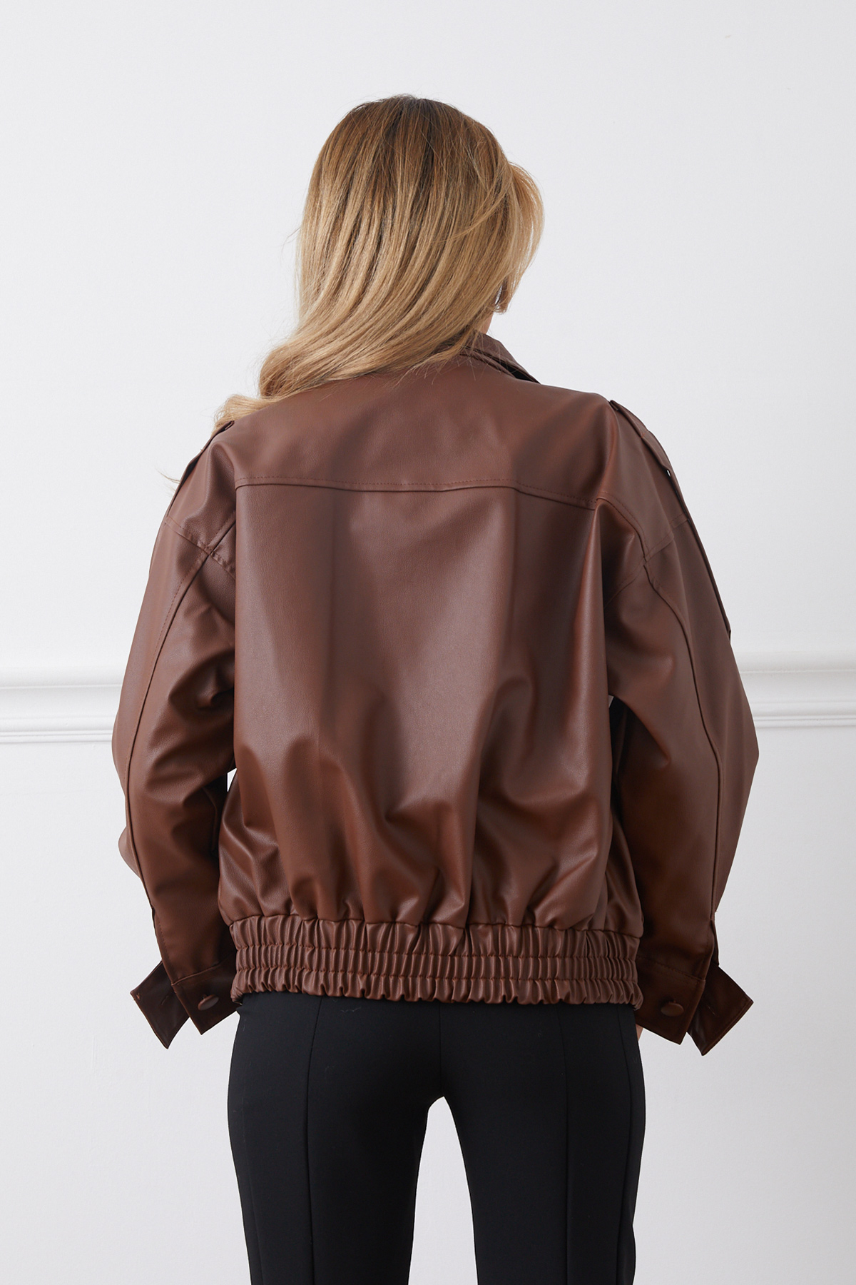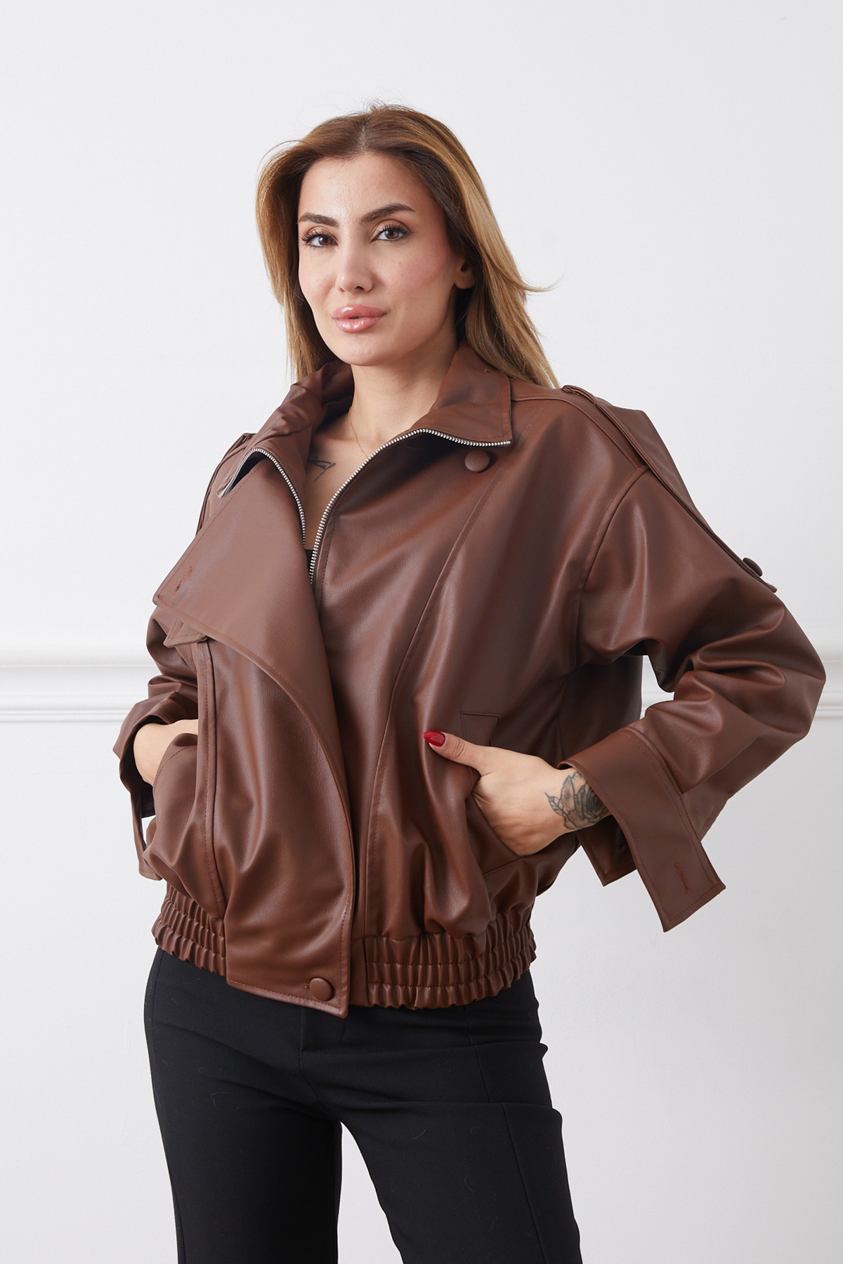Suni Deri Beli Lastikli Gizli Fermuarlı Ceket-Kahve