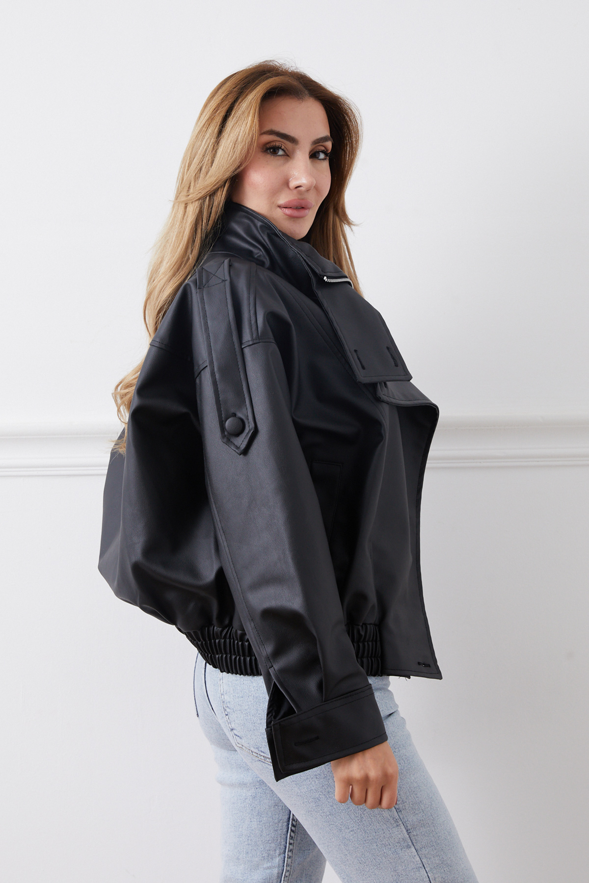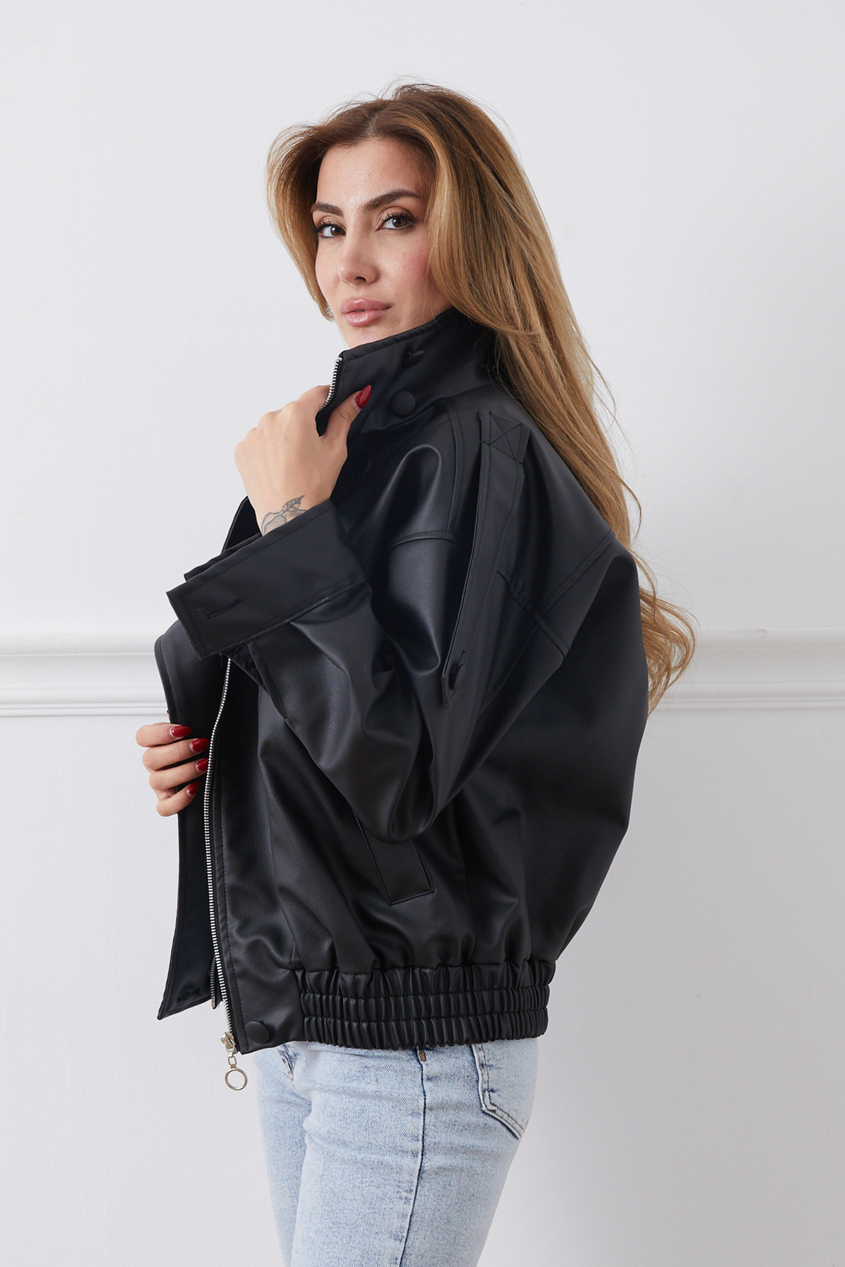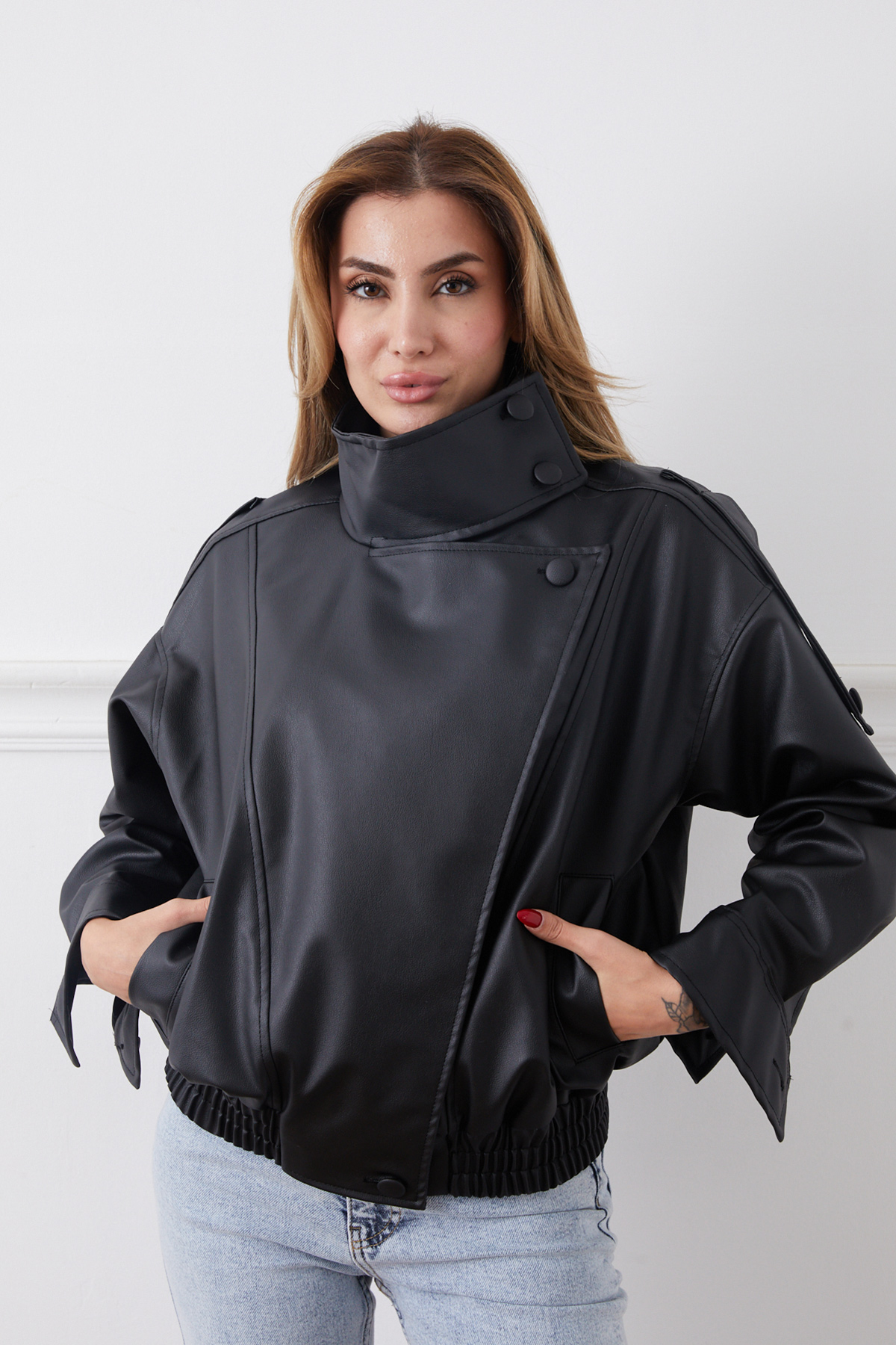 Suni Deri Beli Lastikli Gizli Fermuarlı Ceket-Siyah