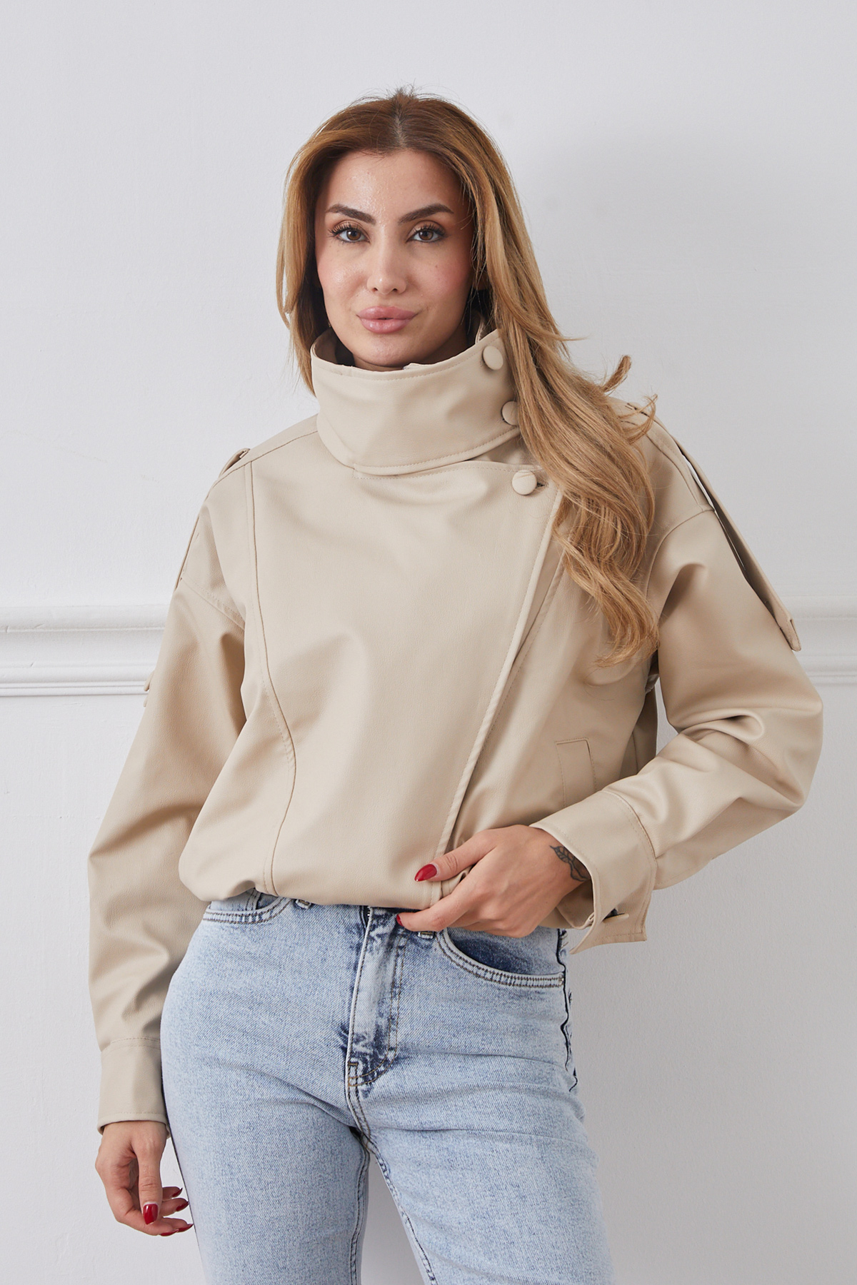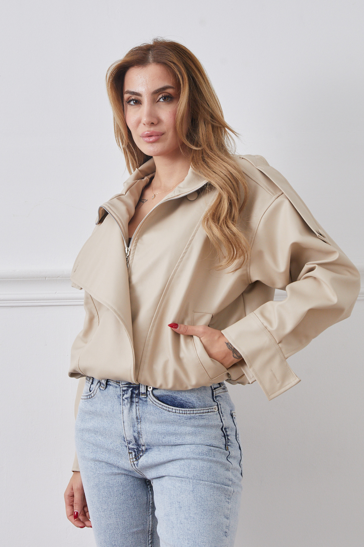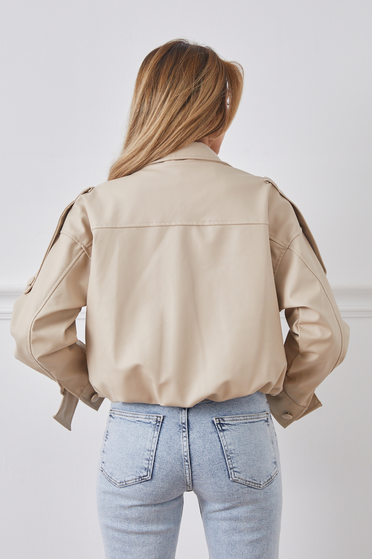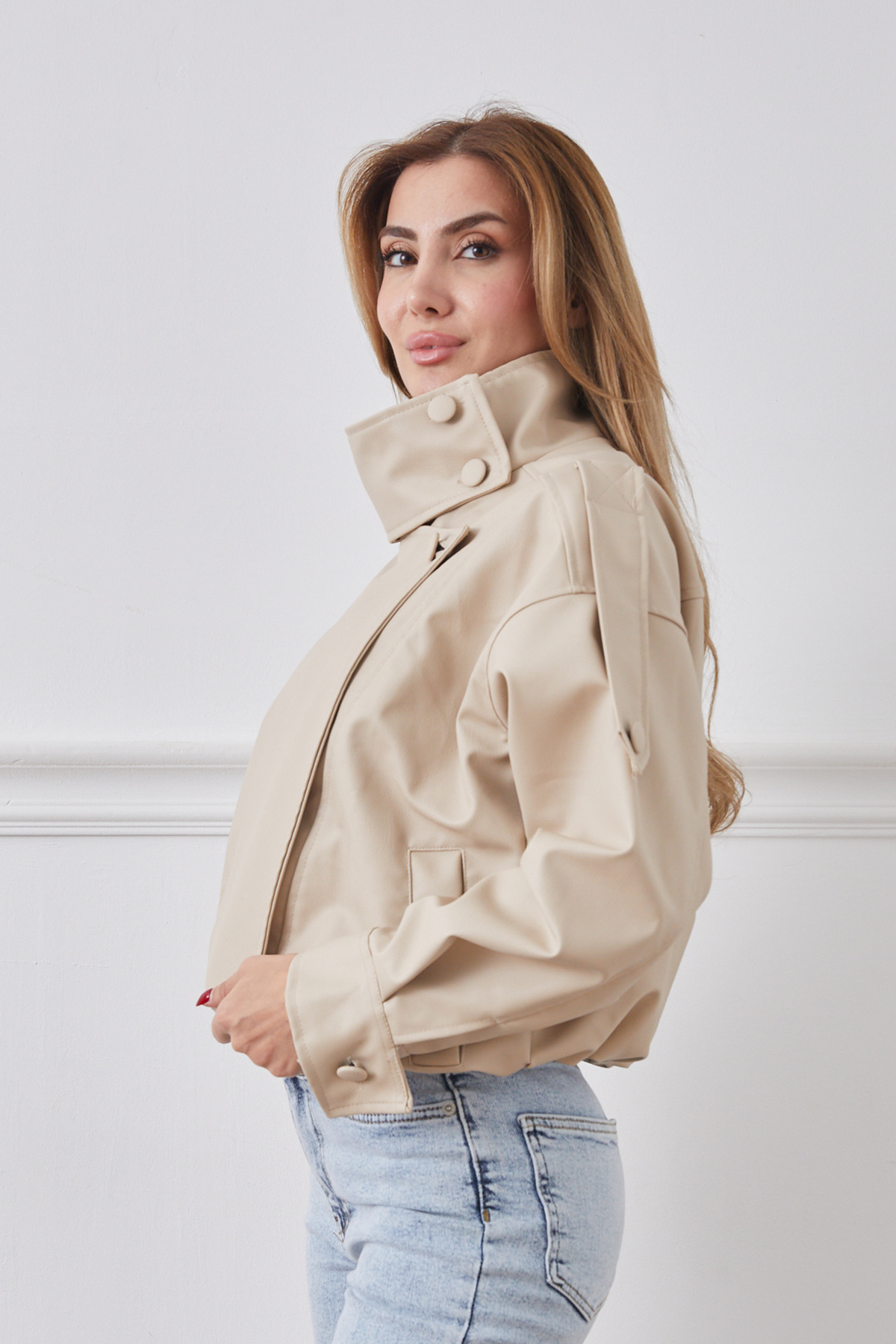 Suni Deri Beli Lastikli Gizli Fermuarlı Ceket-Bej