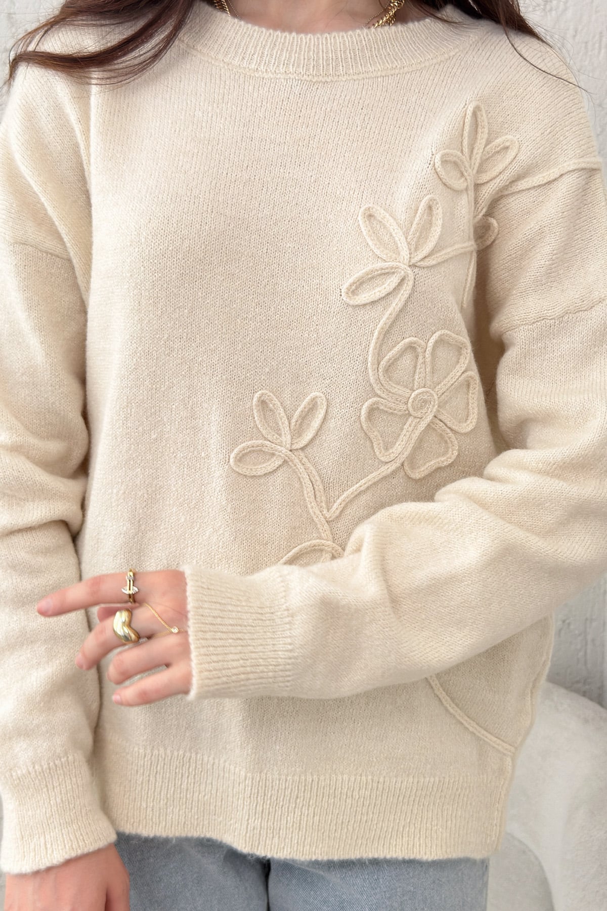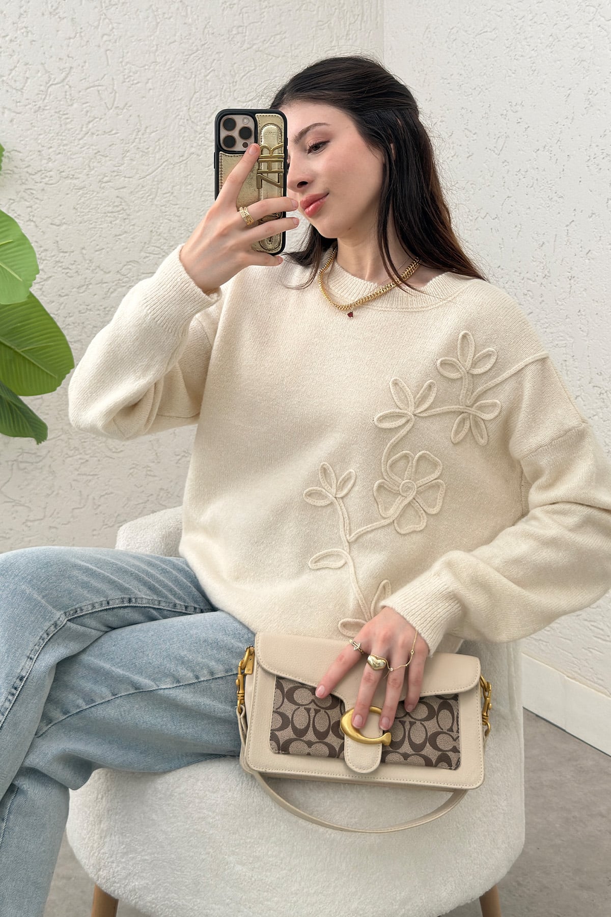 Süzene Nakışlı Triko Kazak Ekru-Ekru