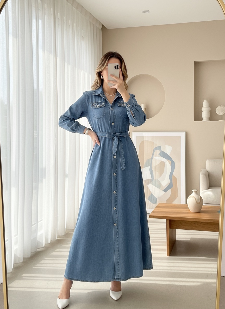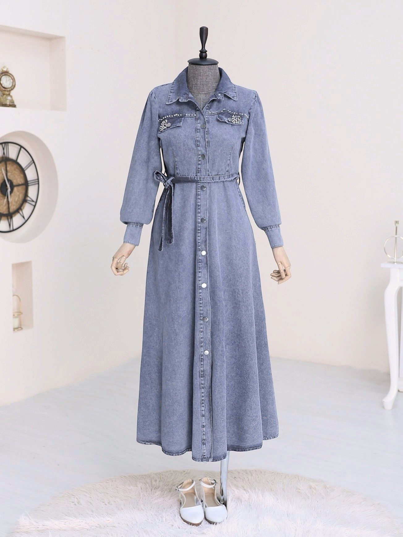 Taş Detaylı Boydan Düğmeli Kot Elbise -İndigo-İndigo