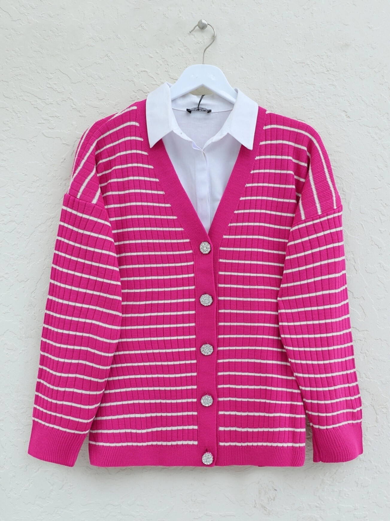 Taş Detaylı Düğmeli Triko Hırka -Fuşya-Fuşya