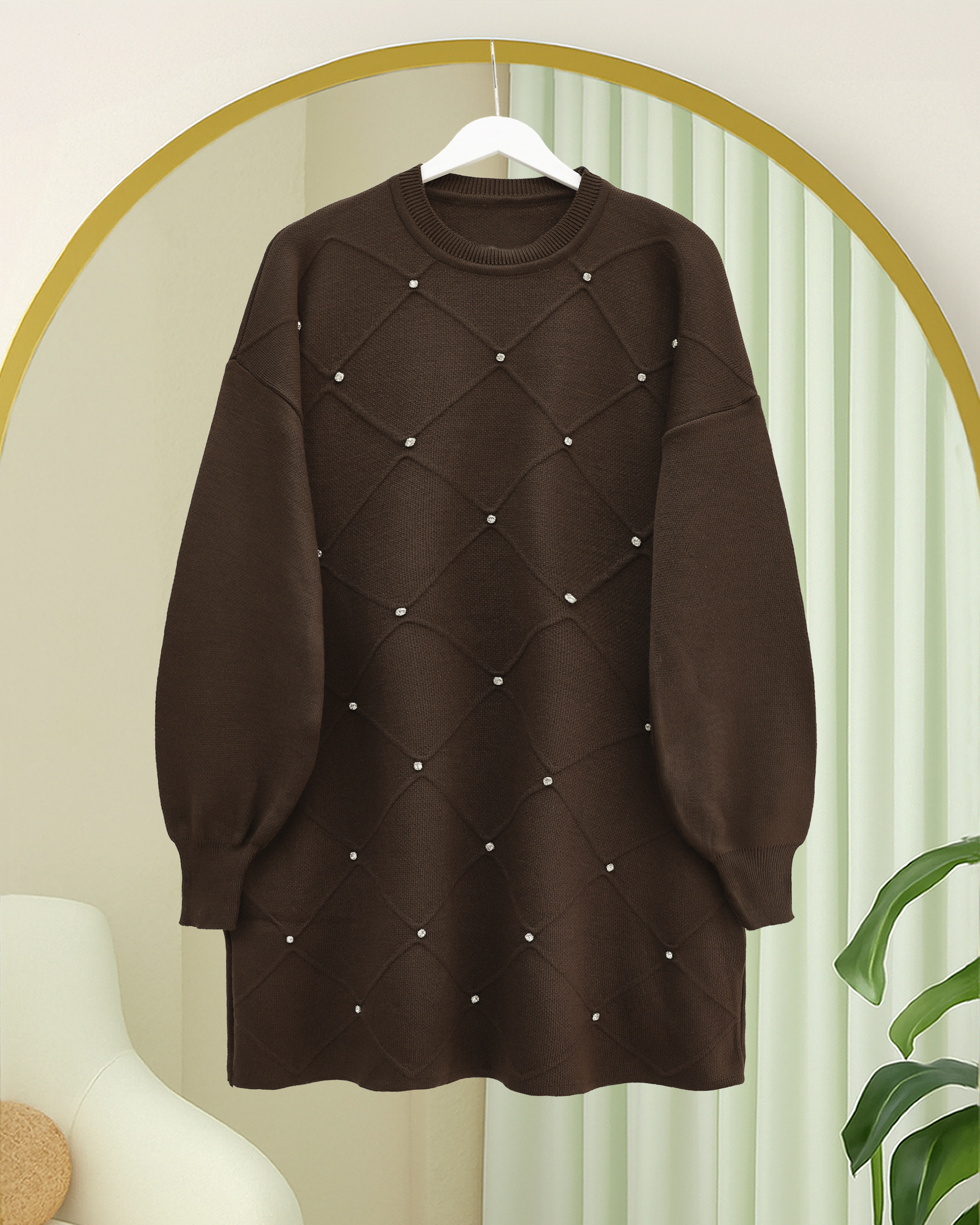 Taş Detaylı Kare Desenli Triko Tunik -Kahve-Kahve