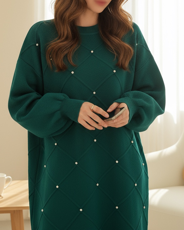 Taş Detaylı Kare Desenli Triko Tunik -Zümrüt-Zümrüt