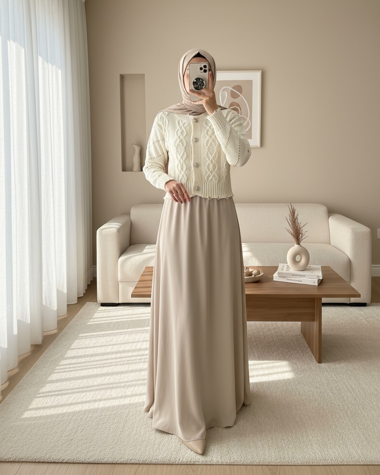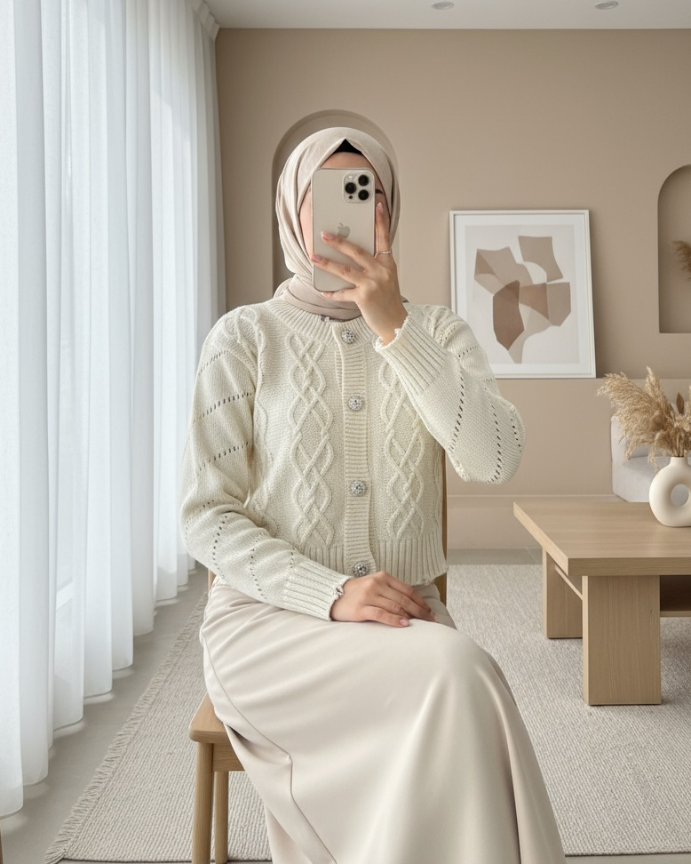 Taş Düğmeli Yırtıklı Krop Hırka -Bej-Bej