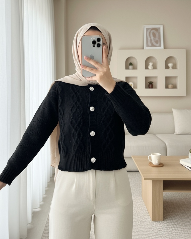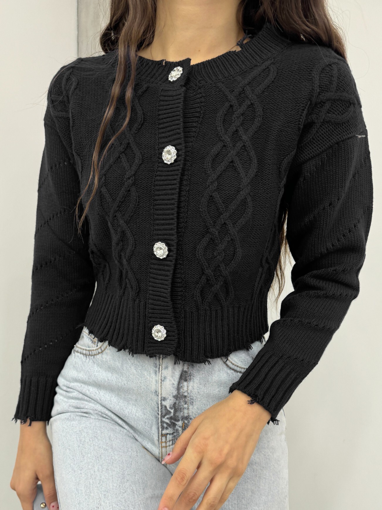 Taş Düğmeli Yırtıklı Krop Hırka -Siyah-Siyah