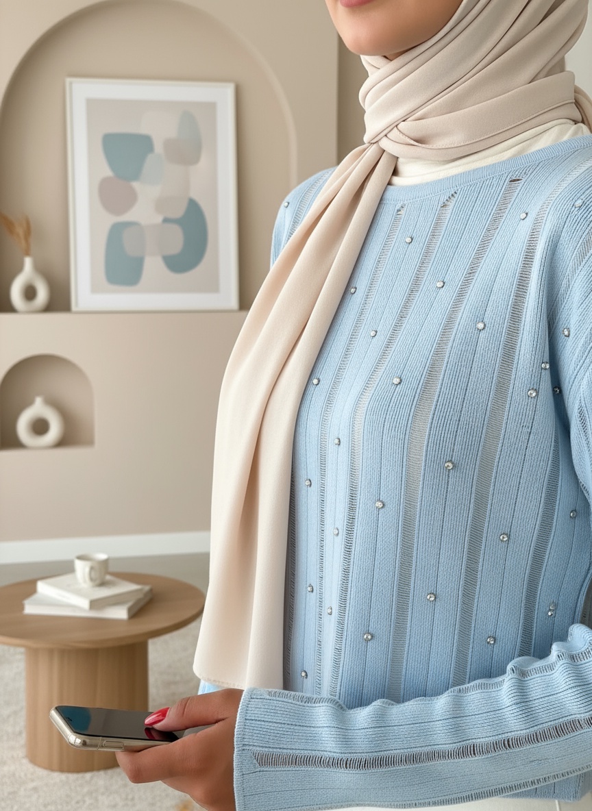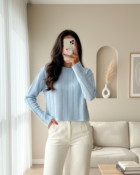Taşlı Ajurlu Triko Kazak -Mavi-Mavi