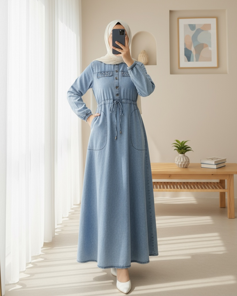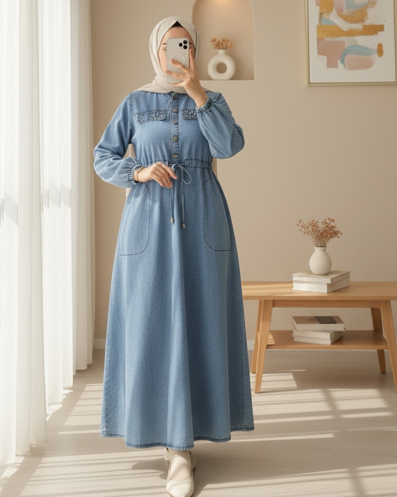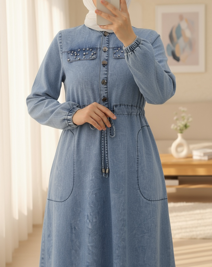 Taşlı Cep Detaylı Tünel Bağcıklı Kot Elbise -Buz Mavi-Buz Mavi