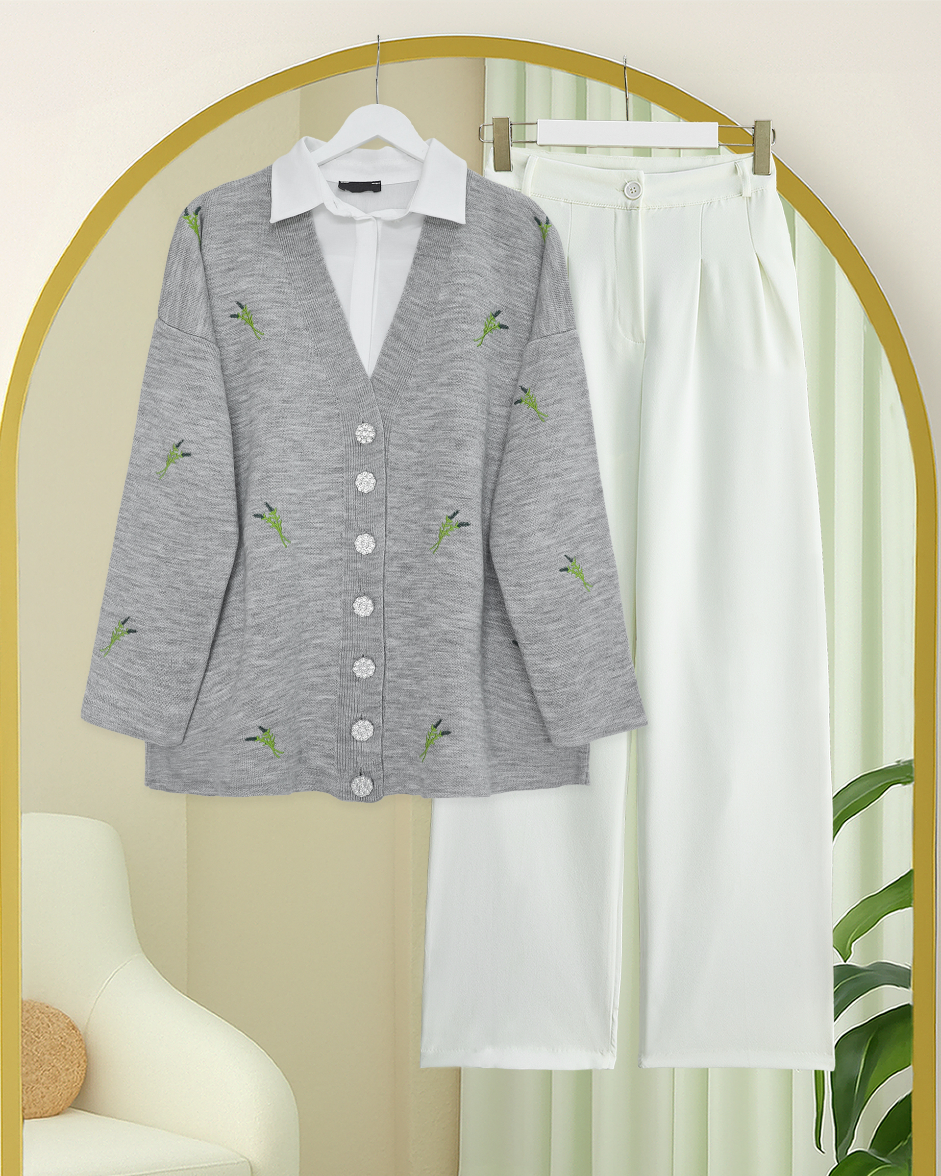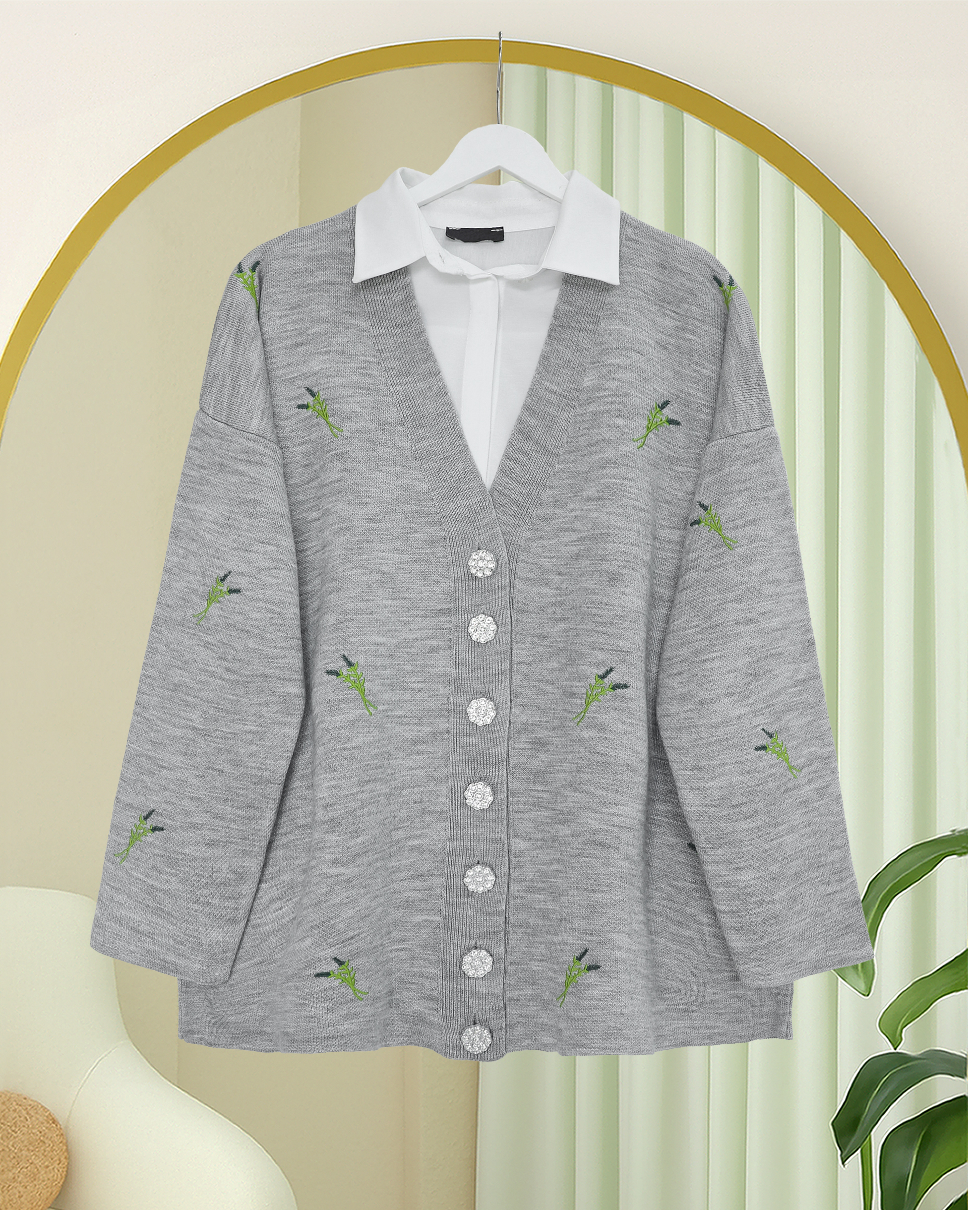 Taşlı Düğmeli Dal Desenli Triko Hırka -Gri-Gri
