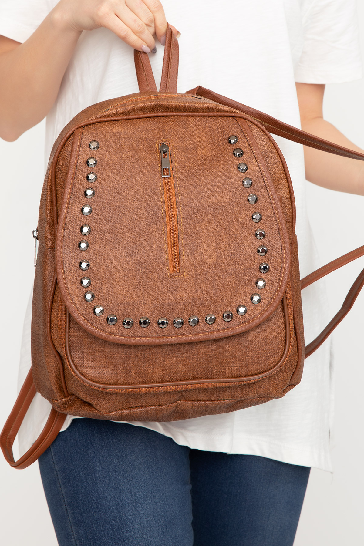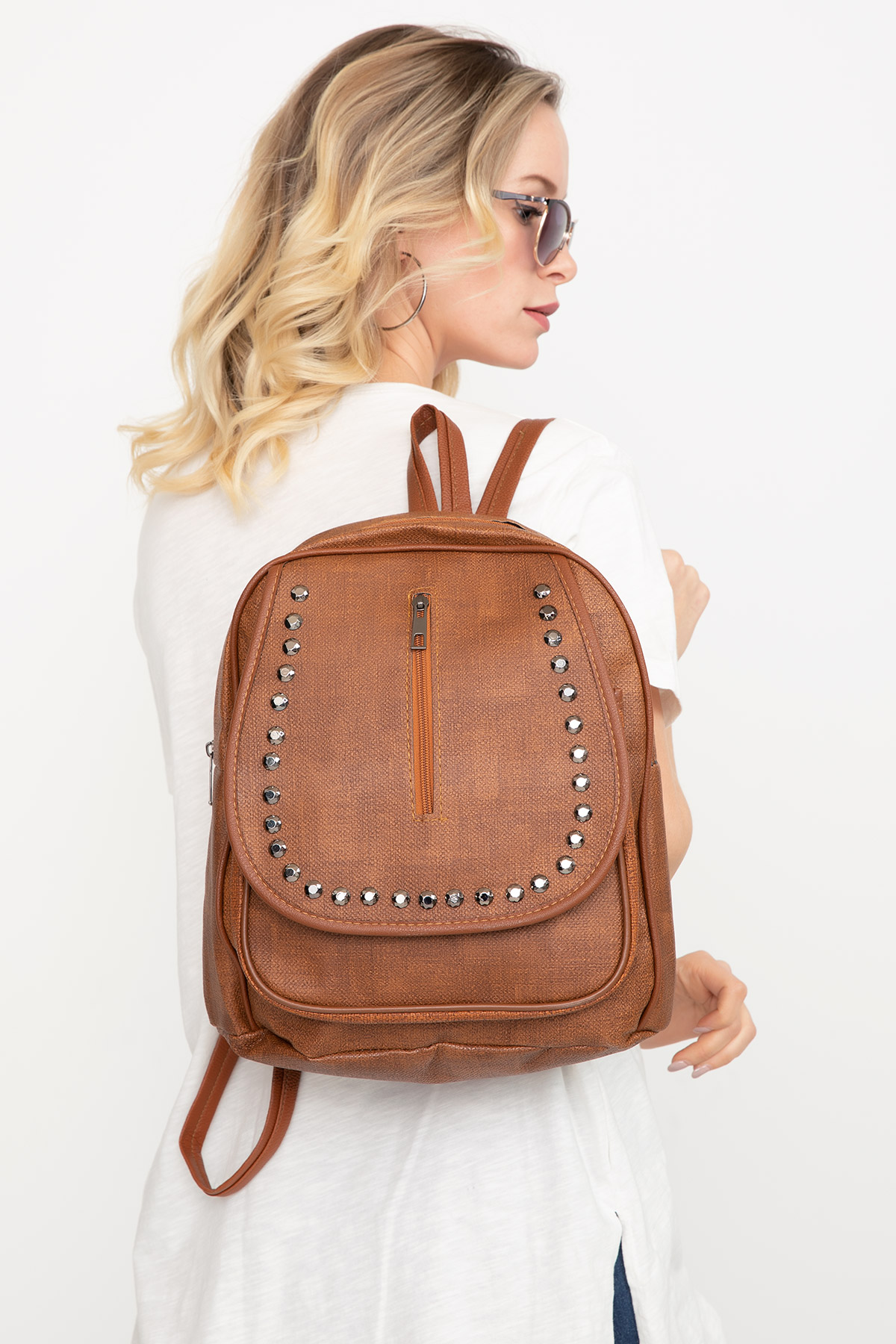 Taşlı Sırt Çantası-Taba