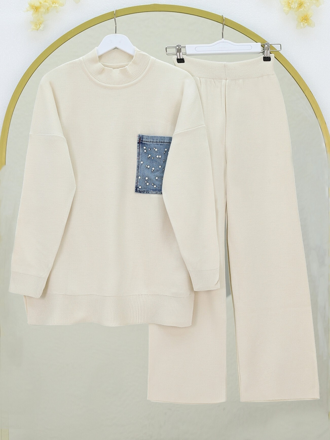 Tek Cepli İncili Triko Takım -Krem-Krem
