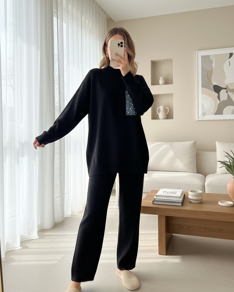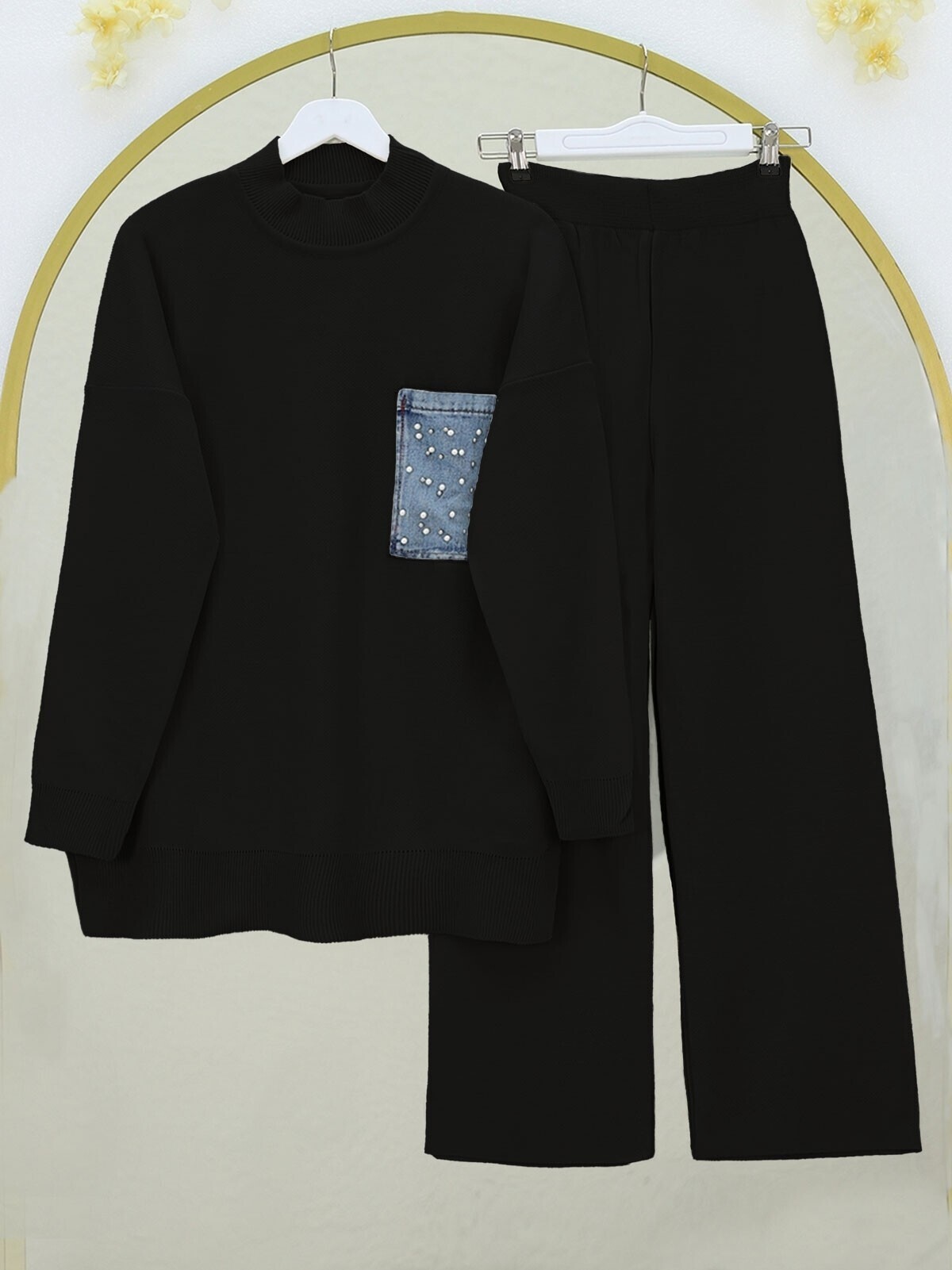 Tek Cepli İncili Triko Takım -Siyah-Siyah