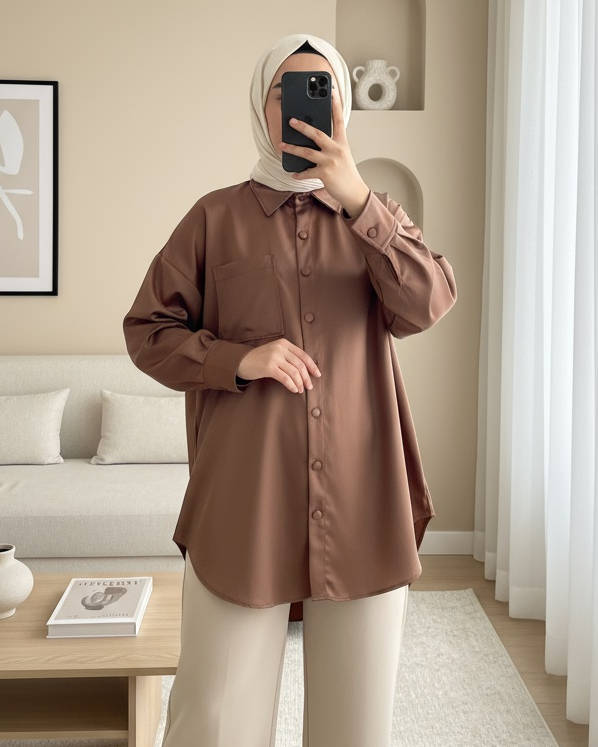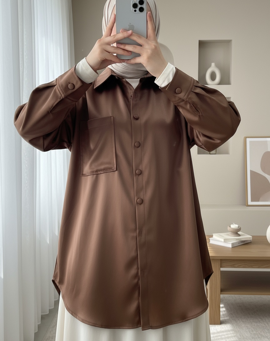 Tek Cepli Oval Kesim Deri Gömlek -Kahve-Kahve
