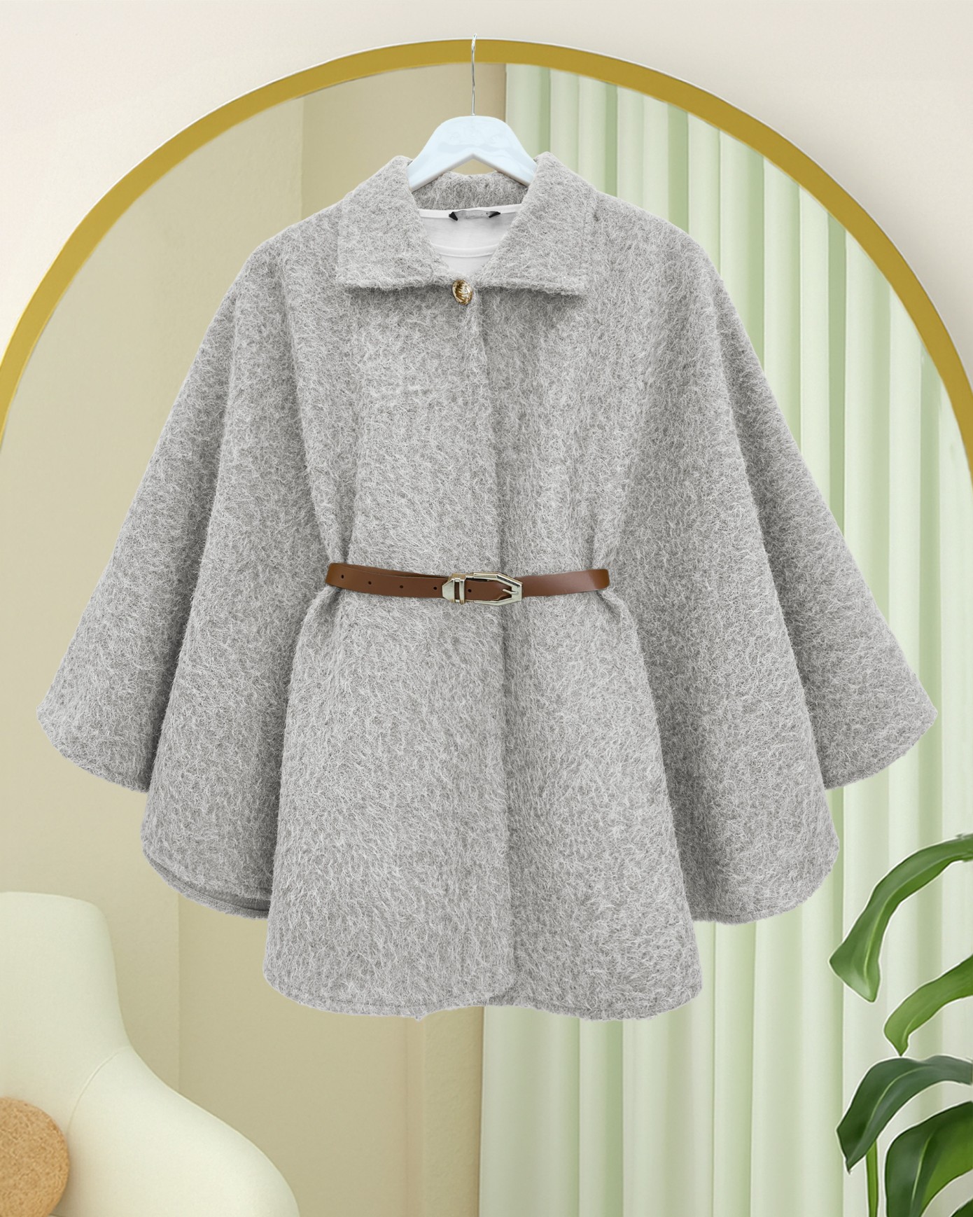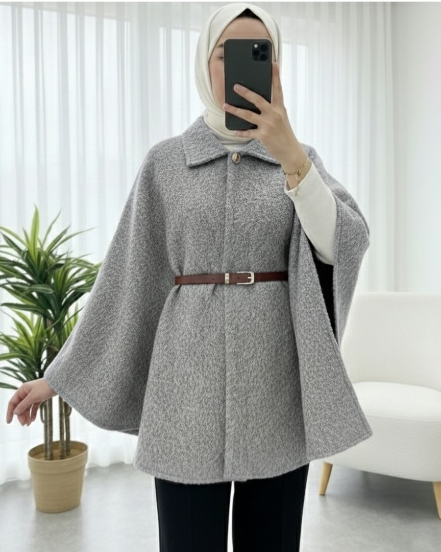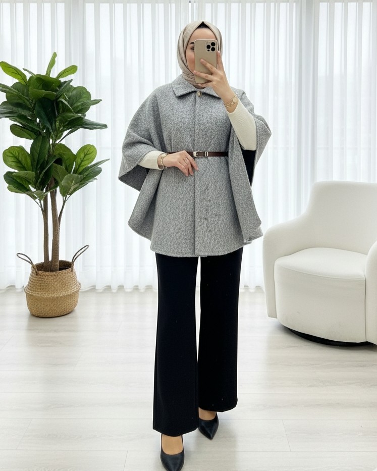 Tek Düğmeli Beli Kemerli Sakallı Panço -Açık Gri-Açık Gri