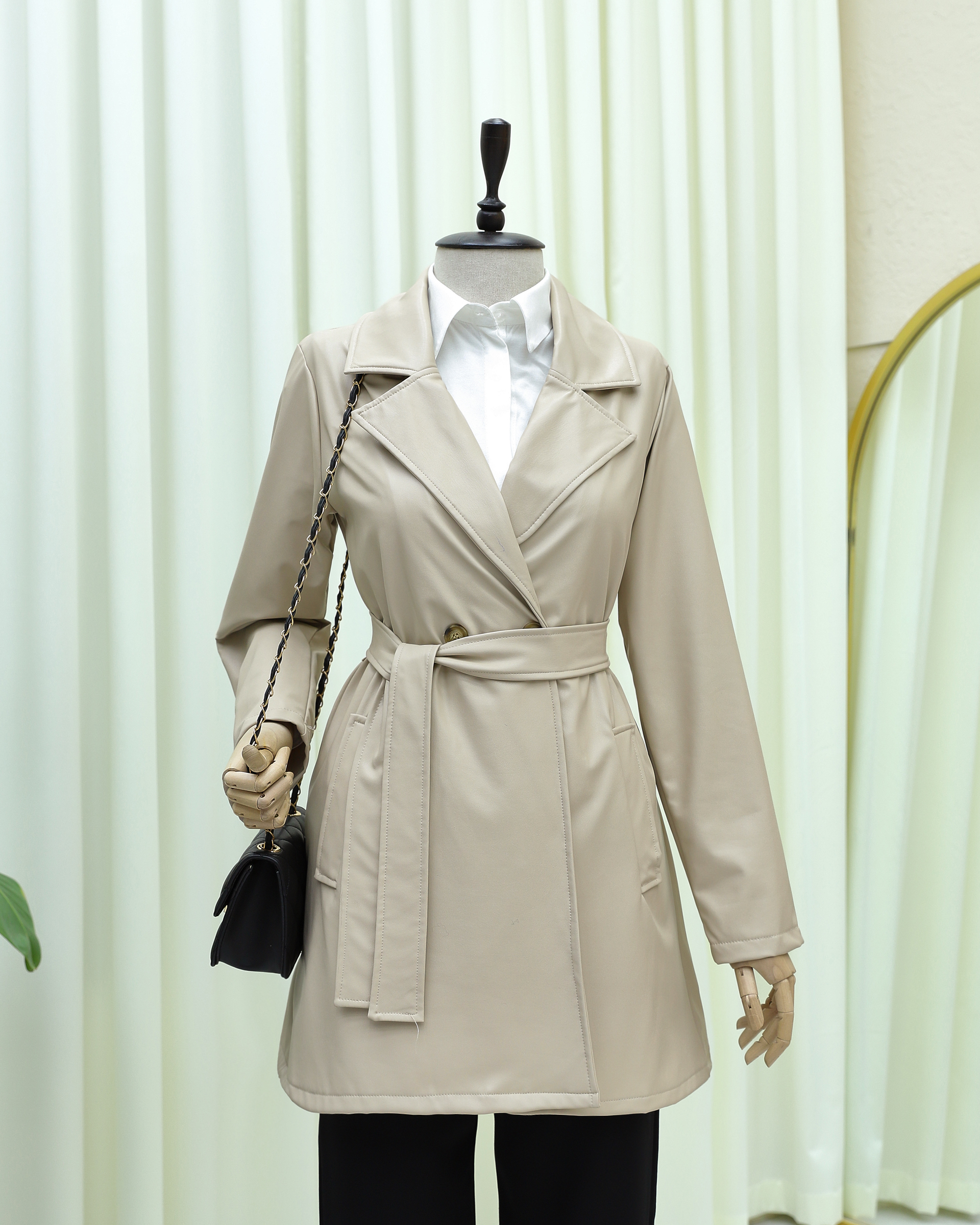 Tek Düğmeli Cepli Belden Bağlamalı Deri Trençkot -Krem-Krem