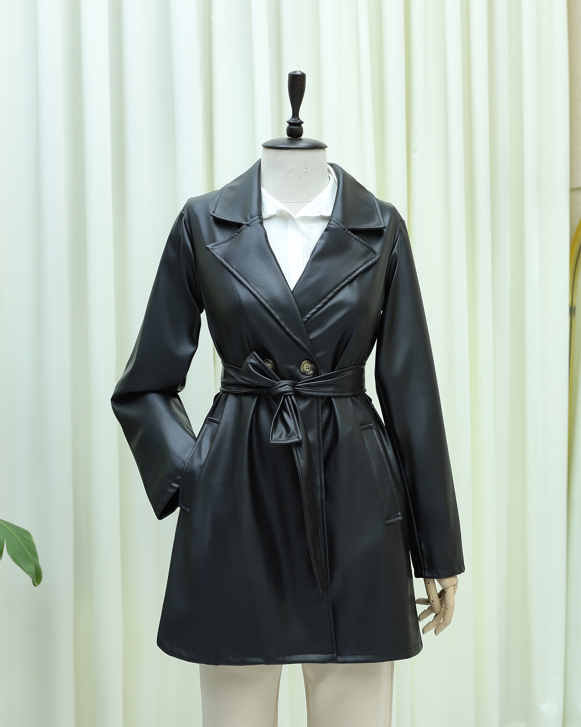 Tek Düğmeli Cepli Belden Bağlamalı Deri Trençkot -Siyah-siyah