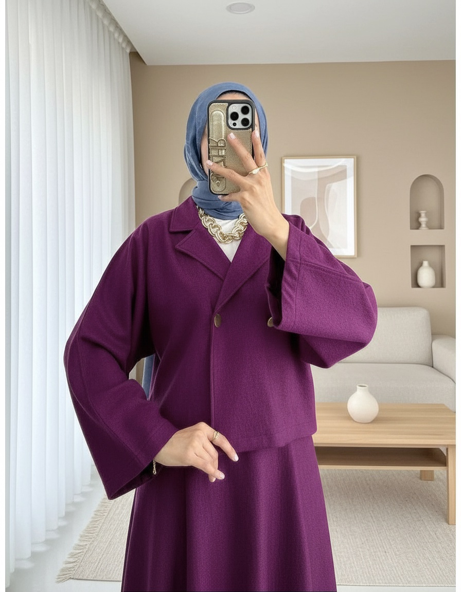 Tek Düğmeli Etekli Keçe Takım -Mürdüm-Mürdüm
