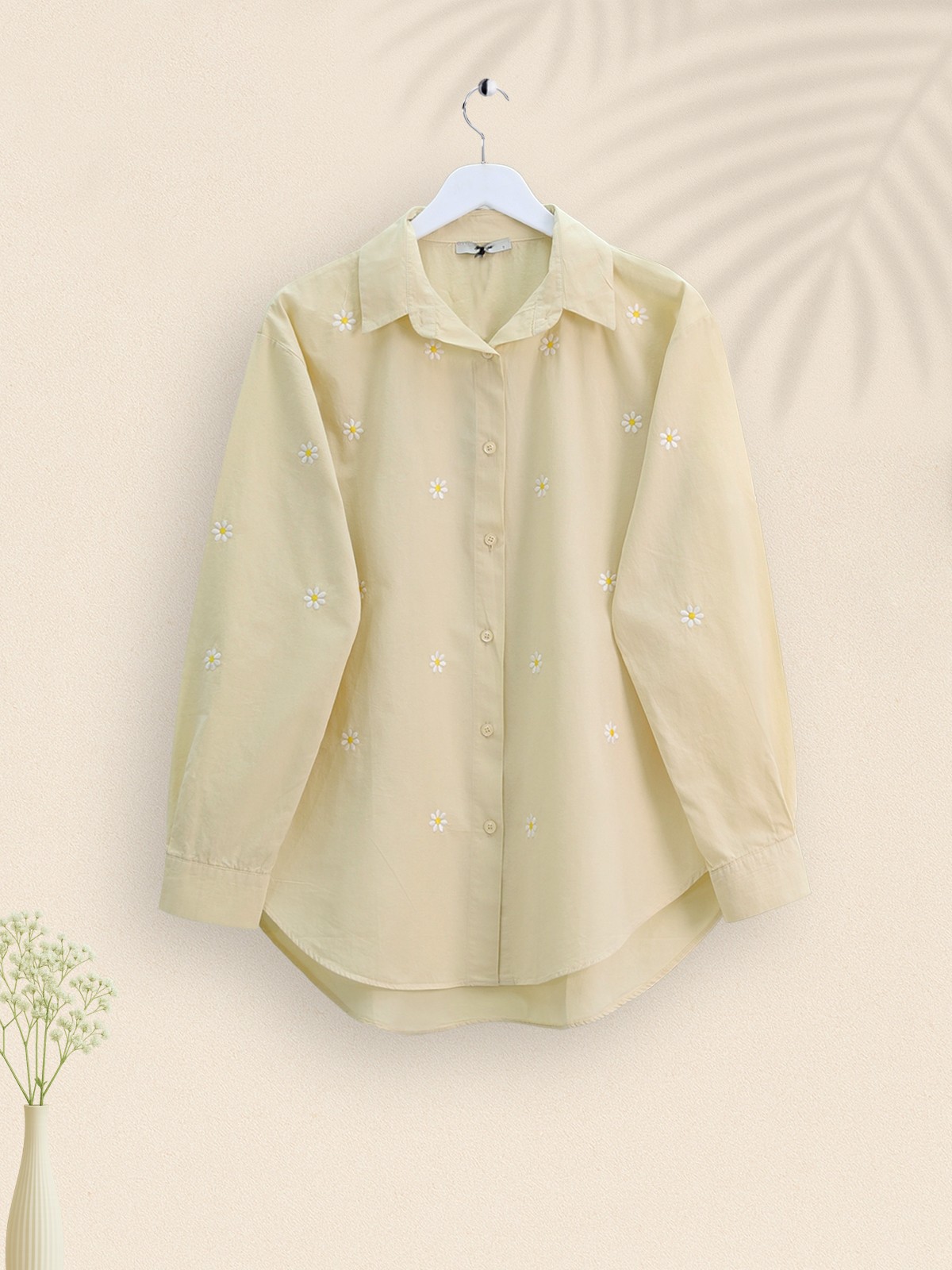 Tek Papatya Nakışlı Arkası Uzun Gömlek -Bej-Bej