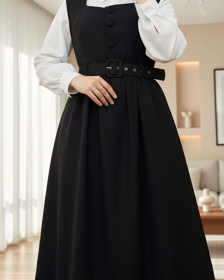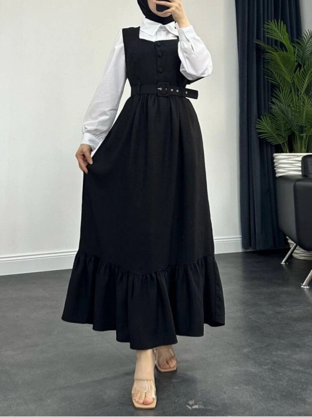 Top Düğmeli Altı Fırfırlı Beli Kemerli Jile Elbise -Siyah-siyah