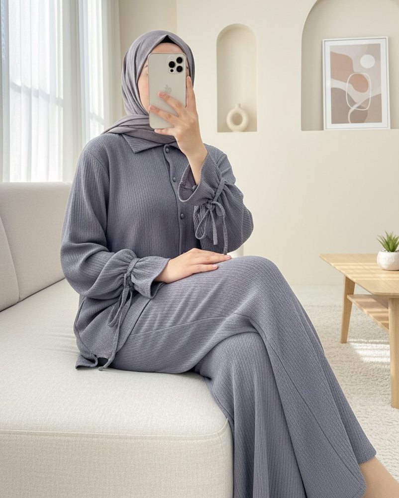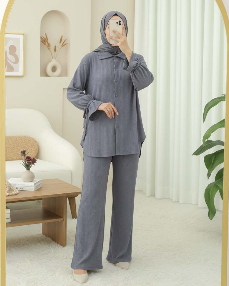 Top Düğmeli Kolu Bağcıklı Krinkıl Takım -Gri-Gri