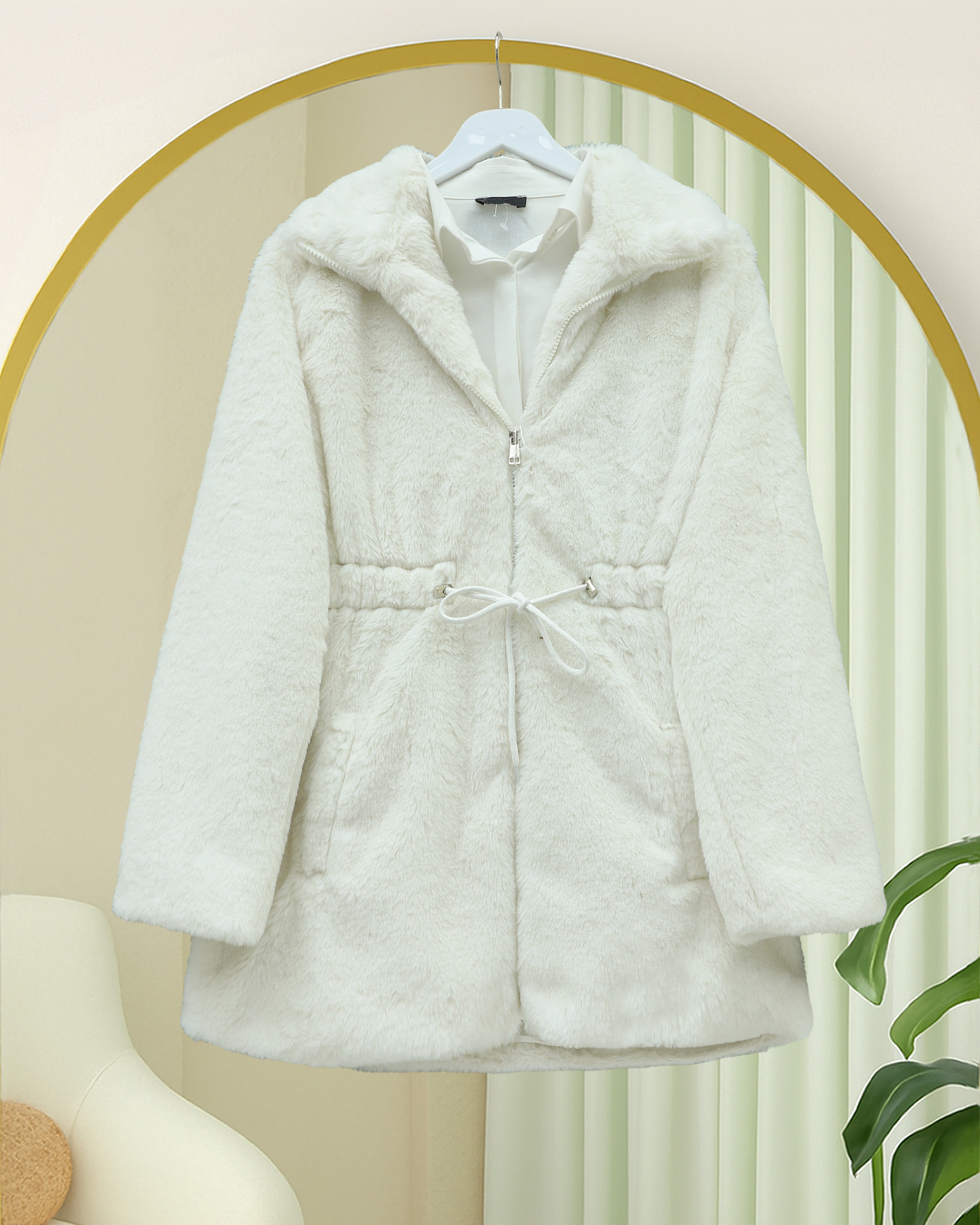 Tünel Bağcıklı Cepli Astarlı Kürklü Ceket -Ekru-Ekru